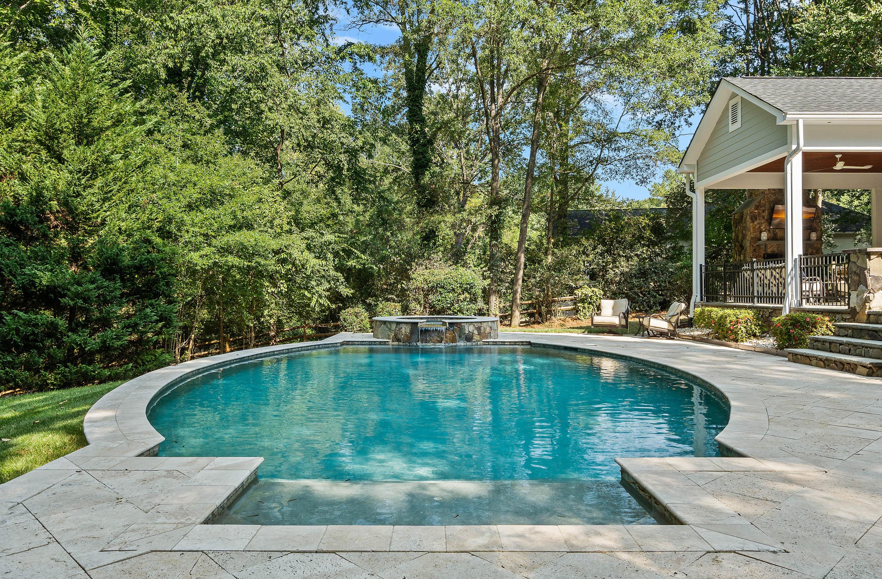 • Open floorplan from kitchen to family room with a breakfast/dining area, gas fireplace, built-in cabinetry and an abundance of windows overlooking the pool, covered porch, and terrace. This area offers wonderful natural lighting and great connectivity to the outdoor living space