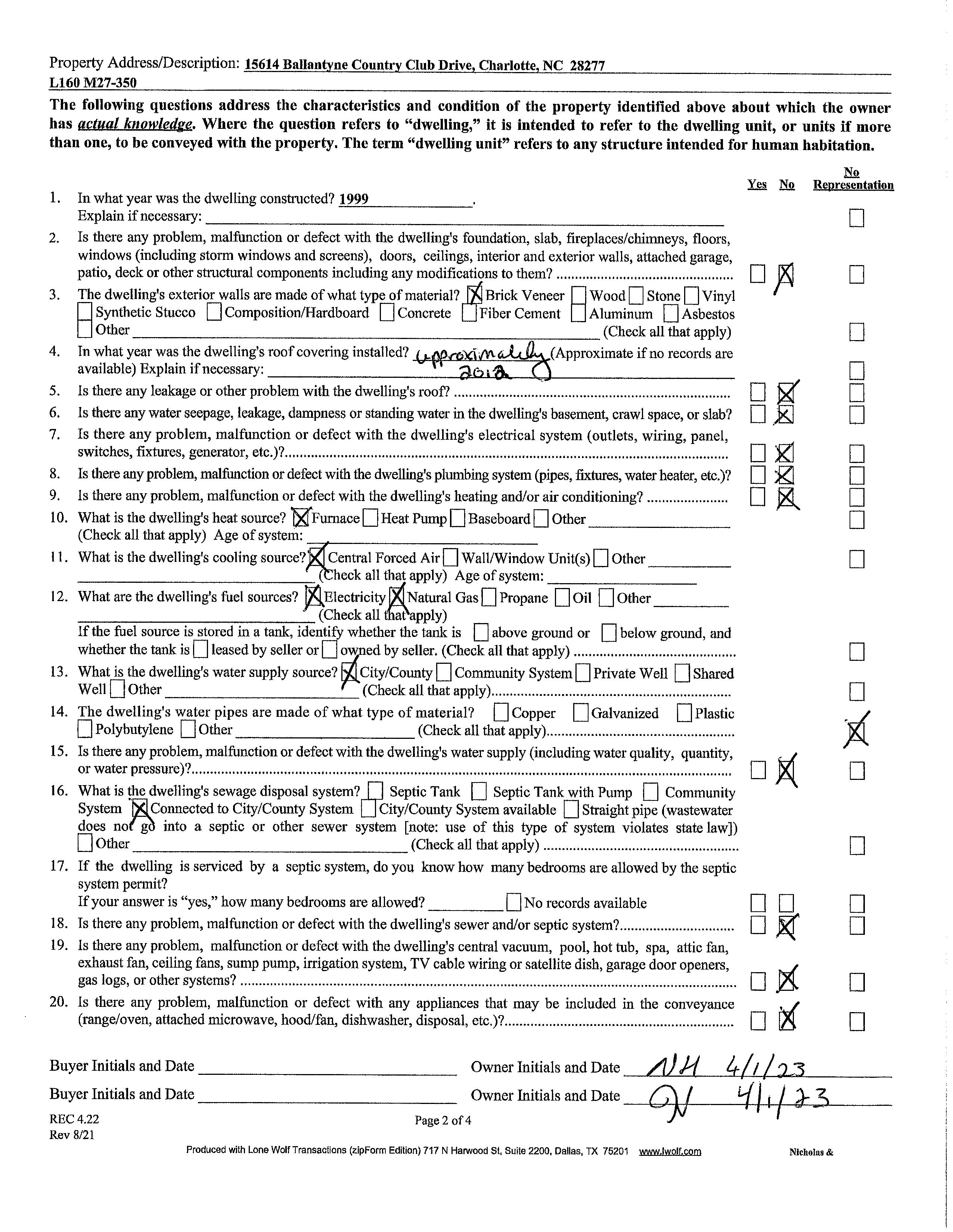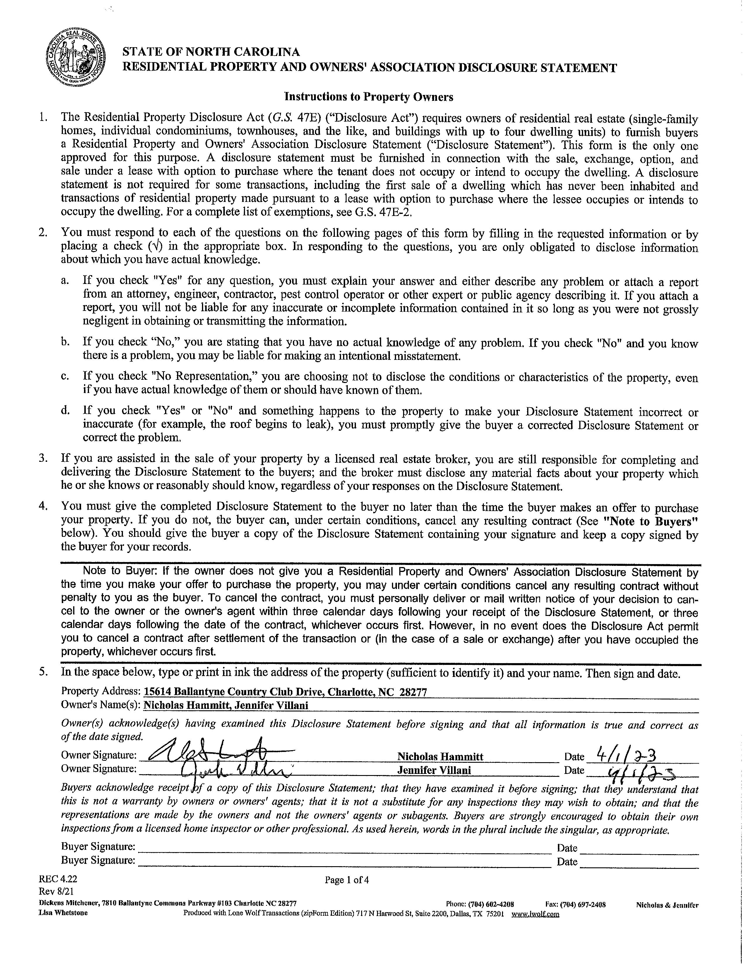 This Seller Disclosure by the property’s record title owner(s) (“Weichert Seller”) Nicholas Hammitt, Jennifer C Villani, concerns the real property and fixtures (the “Property”) located at the following address: 15614 Ballantyne Country Club Drive, Charlotte North Carolina 28277 United States.