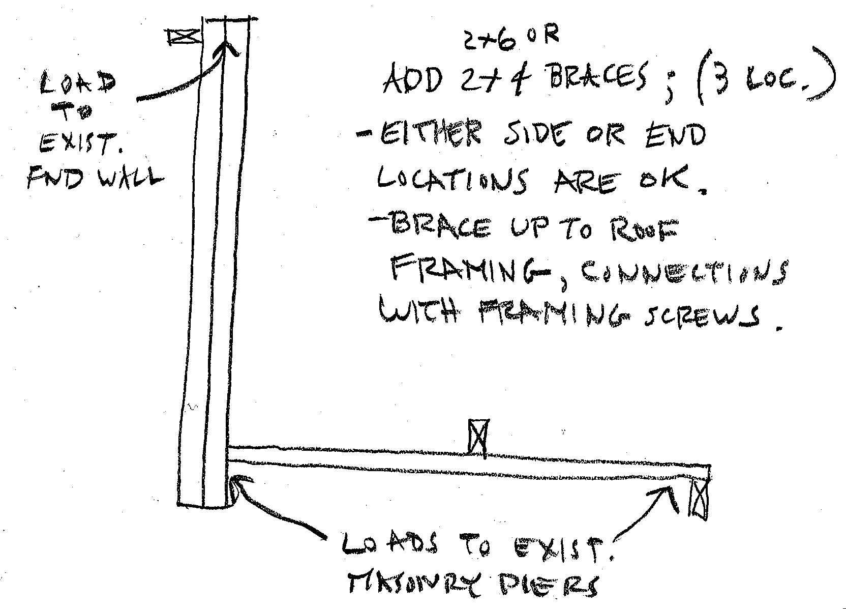 In the attic, a single and double 11-7/8” LVL can be seen along with strap hangers for ceiling joists. The beams are sufficiently sized for residential code required loading, and the work appears to be of adequate quality. There are no end- or mid-span braces; I recommend adding three braces as noted on the sketch below.