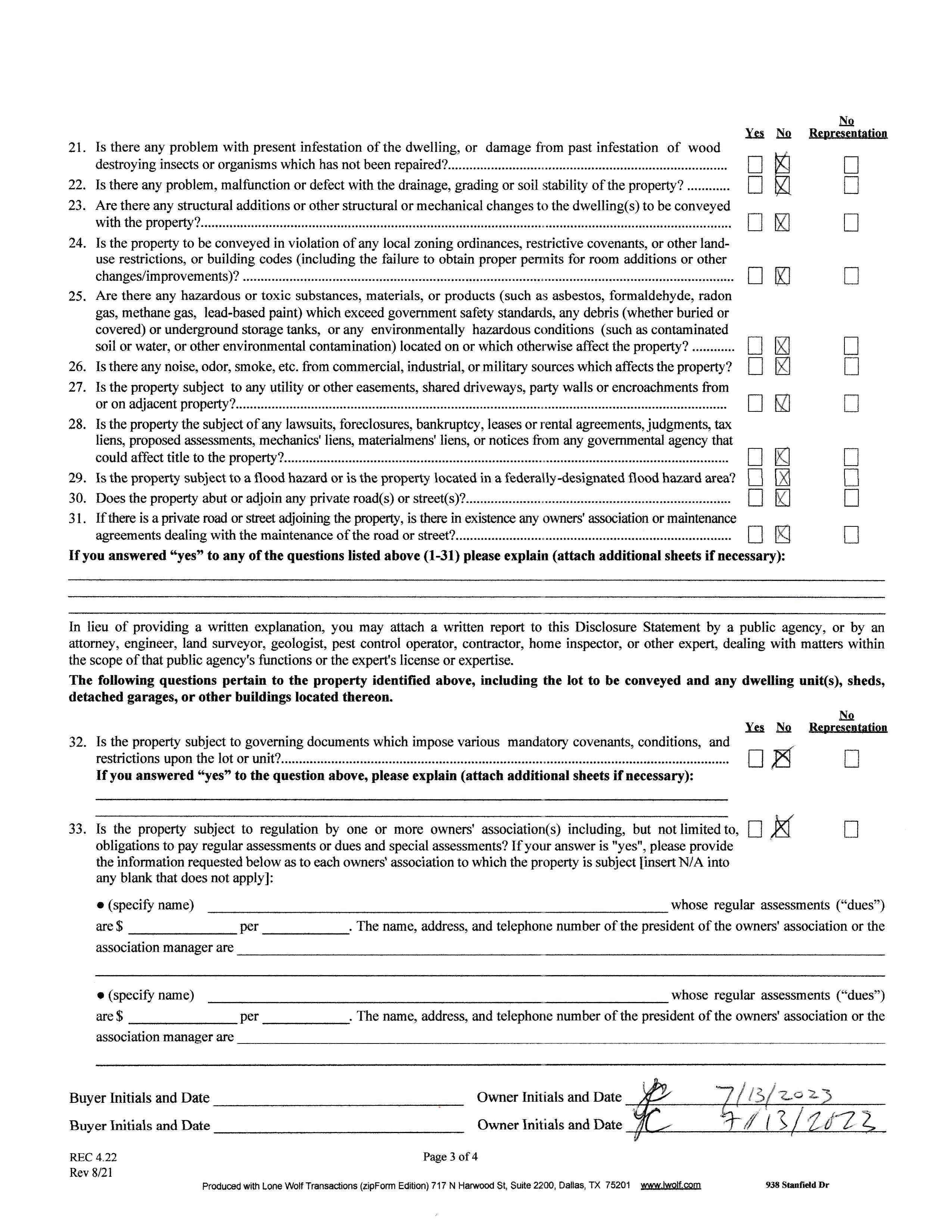 Owner(s) acknowledge(s) having examined this Disclosure Statement before signing and that all information is true and carrect as of the date signed. B f zaz3