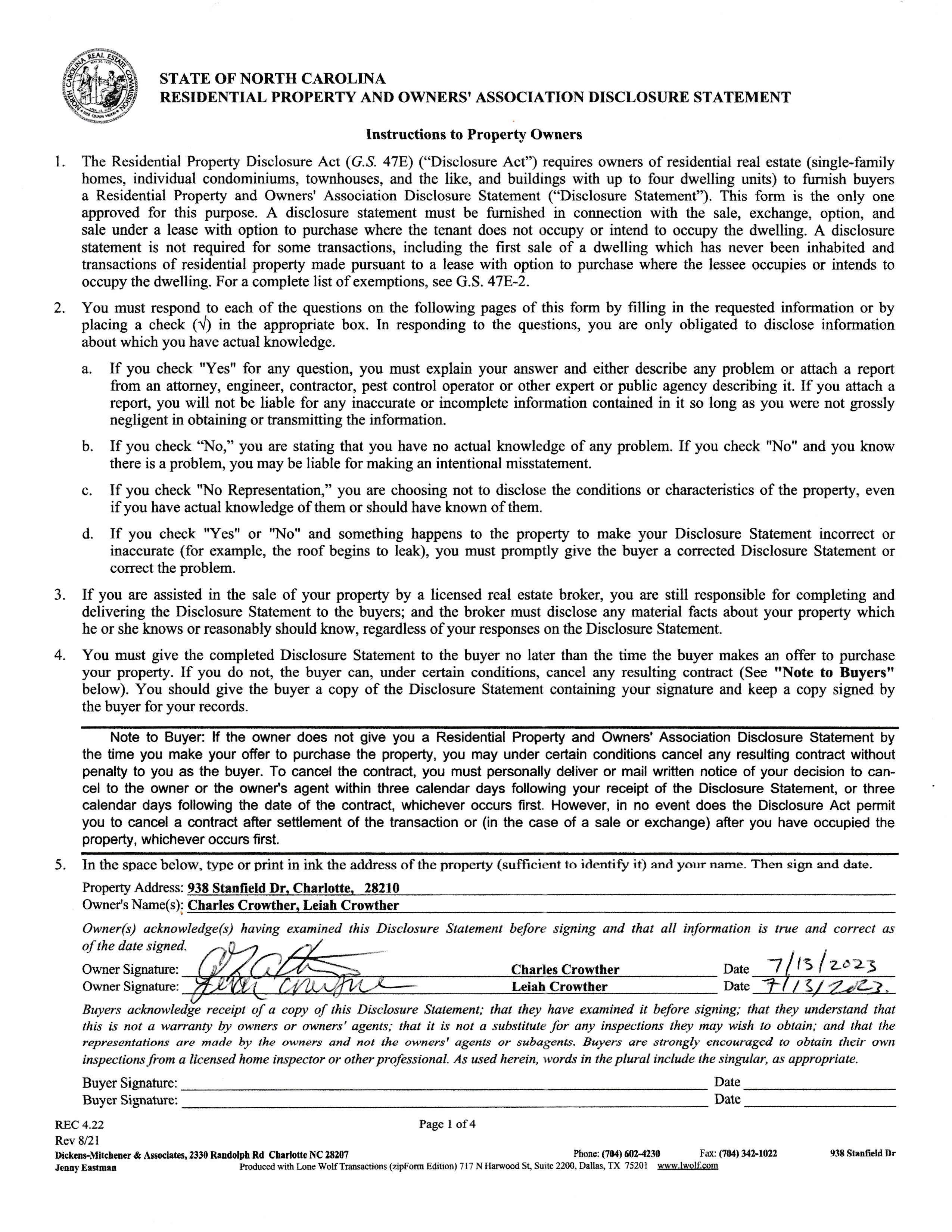The Residential Property Disclosure Act (G.S. 47E) ("Disclosure Act') requires owners of residential real estate (single-family homes, individual condominiums, townhouses, and the like, and buildings with up to four dwelling units) to furnish buyers a Residential Property and Owners' Association Disclosure Statement ('Disclosure Statement'). This form is the only one approved for this purpose. A disclosure statement must be fumished in connection with the sale, exchange, option, and sale under a lease with option to purchase where the tenant does not occupy or intend to occupy the dwelling. A disclosure statement is not required for some transactions, including the first sale of a dwelling which has never been inhabited and transactions of residential property made pursuant to a lease with option to purchase where the lessee occupies or intends to occupy the dwelling. For a complete list of exemptions, see G.S. 4TE-2. You must respond to each of the questions on the following pages of this form by filling in the requested information or by placing a check (1) in the appropriate box. In responding to the questions, you are only obligated to disclose infomration about which you have actual knowledge.