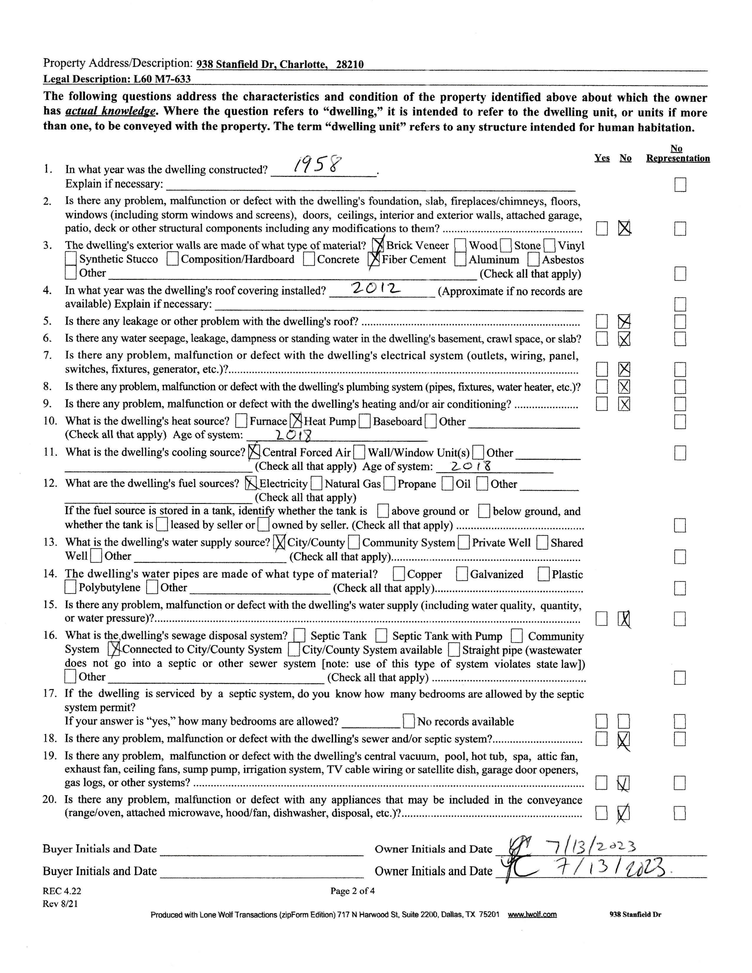 The following questions pertain to the property identified above, ineluding tte lot to be conveycd and any dwelling uni(s), sheds, detached garages, or ofter buildings Iocated tftereon.