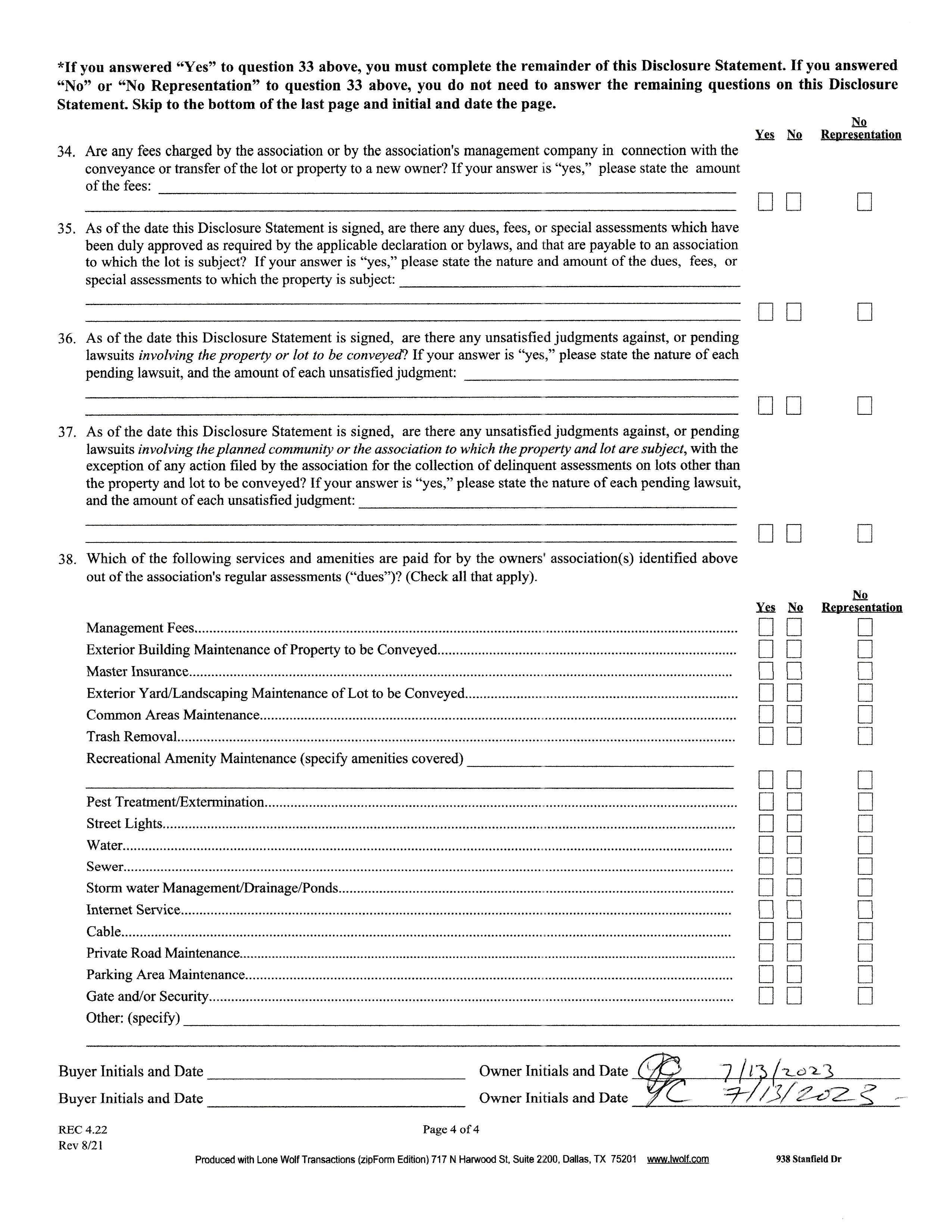*ff you answered "Ye$' to question 33 above, you must complete the remainder of this Disclosure Statement. If you answered "No'o or (No Representation" to question 33 above, you do not necd to answer the remainhg questions otr this Disclosure Statement Skip to the bottom of the last page and initial and date the page.
