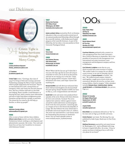 2002 Michael W. Donnelly 62 Wagon Wheel Road Quakertown, PA 18951 profe207@gmail.com Angela Wallis amwallis@gmail.com Brian Blake was mistakenly referred to as “she” in his class note on Page 45 in the fall 2016 issue. Kristin Masters’ new book, The Morning Tree, was published by Indie Gypsy. Read more in Fine Print, Page 8. Matthew Stevenson acquired his real estate license