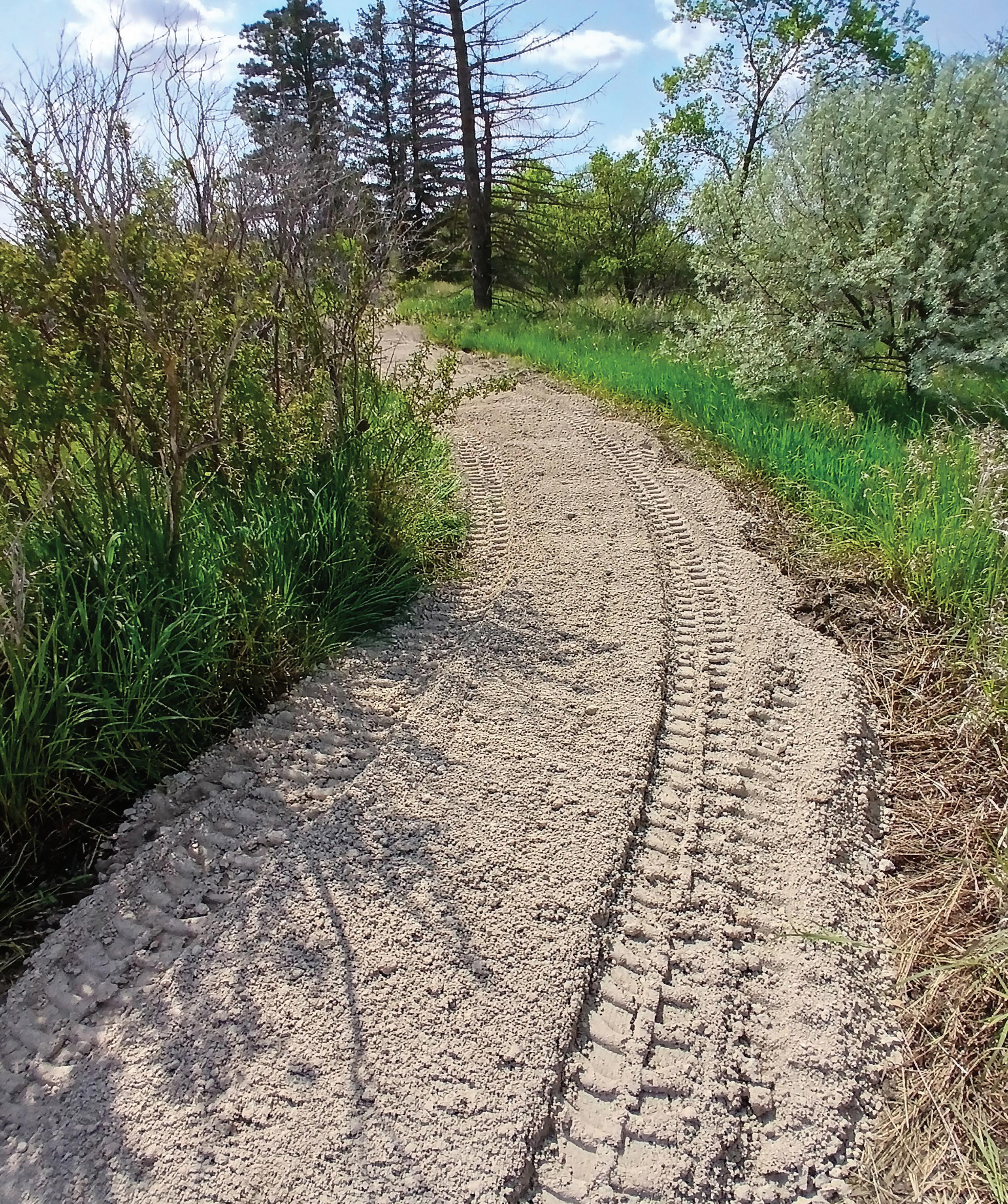 The Crooked Crane Trail, established in 1999, is a multi-surface trail that winds around the Patterson Lake Recreation Area, which is owned and operated by the Dickinson Parks and Recreation District. The Stranski segment of the trail extends through the northwest portion of the recreation area, connecting the Nyoda (Trap Club) Trailhead to the Stranski Trailhead. The goal of this project was to construct a permanent and sustainable 4-foot-wide natural surface trail suitable for both hikers and cyclists along this 1.3-mile section. Two new loops were added, incorporating a variety of cycling features such as tabletops, rollers, and small berm turns, increasing the total trail distance to 2.37 miles. Additionally, culverts were installed at four drainage crossings to improve water management. As part of the overall project, the Nyoda (Trap Club) Trailhead was expanded and upgraded in conjunction with the construction of the new trap club facility. Funding for the project was provided through a Recreational Trails Program (RTP) grant, with matching contributions from Marathon Petroleum and material donations from Stark County.