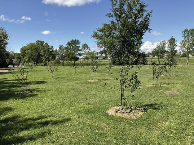The goal of this project was to bring the first community orchard to the City of Dickinson to promote fruit production in North Dakota by educating the community on the wide variety of fruits and berries that are hardy enough to survive the winters in SW North Dakota. The orchard utilizes a previously undeveloped park property in the Nuhaven subdivision. Our first planting in May 2025 consists of 46 trees with many varieties of apple, cherry, pear, and plum trees provided by a generous donation from TJ Herauf (Coca-Cola of Dickinson). Additional supplies were provided by a North Dakota Forest Service Community Family Forest Grant. Berry rows will be added in the spring of 2026. When the fruit is ready for harvest in late summer, access to the orchard will be available by appointment. The Park District will be looking for volunteers to help with pruning, watering, and harvesting in the coming years.