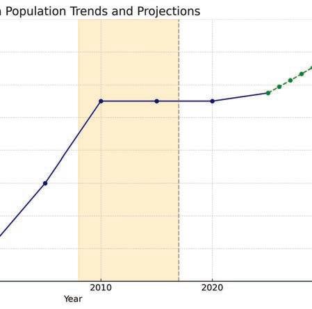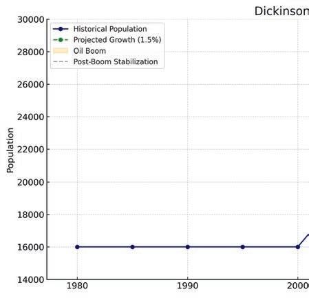 Dickinson’s population held steady at about 16,000 from 1980–2008, then surged to 25,000 during the 2008–2017 oil boom, including many transient workers. Since 2017, it has stabilized as North Dakota’s 7th largest city. Future growth is hard to predict due to oil industry cycles, but current trends suggest stability. The City of Dickinson’s Direction 2050 Plan projects 1.5% growth over the next decade. State e orts to attract immigrant workers are early-stage, with impacts yet unknown.