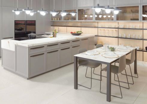 LimoMate Roble Puro deGamadecor b PorcelanosaconlaencimeraKrion K Life1100. La encimeraesel puntodeencuentroentrefuncionalidad y estilo. En gris, seconvierteen unelemento uearmoniza contodoel entorno. Las encimerasdepiedrasinterizada de gran formato, comolas de TO E de Porcelanosa, ofrecen una estética uniforme y una alta resistencia a arañazos, manchasy calor, ideales para cocinas de uso intensivo. Para uienes buscan una solución higiénica y personalizable, Krion de Porcelanosa destaca por su composición antibacteriana, resistencia a golpes y capacidad termoformable, permitiendo diseños curvos y sin juntas visibles. Además, integra fregaderos y electrodomésticos con elegancia. Si se desea un to ue de lujo y durabilidad, los materiales naturales como granito, mármolocuarzoen tonosgrises deAltissima by Porcelanosa, fusionanlomodernoconloartesanal. Suelo vin licoLinkfloor Eco D nast