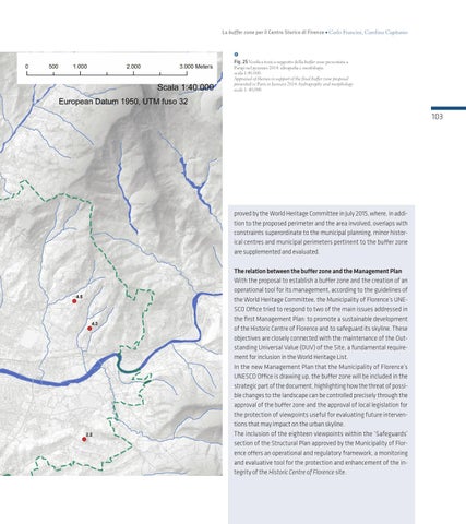 proved by the World Heritage Committee in July 2015, where, in addition to the proposed perimeter and the area involved, overlaps with constraints superordinate to the municipal planning, minor historical centres and municipal perimeters pertinent to the buffer zone are supplemented and evaluated. The relation between the buffer zone and the Management Plan With the proposal to establish a buffer zone and the creation of an operational tool for its management, according to the guidelines of the World Heritage Committee, the Municipality of Florence’s UNESCO Office tried to respond to two of the main issues addressed in the first Management Plan: to promote a sustainable development of the Historic Centre of Florence and to safeguard its skyline. These objectives are closely connected with the maintenance of the Outstanding Universal Value (OUV) of the Site, a fundamental requirement for inclusion in the World Heritage List. In the new Management Plan that the Municipality of Florence’s UNESCO Office is drawing up, the buffer zone will be included in the strategic part of the document, highlighting how the threat of possible changes to the landscape can be controlled precisely through the approval of the buffer zone and the approval of local legislation for the protection of viewpoints useful for evaluating future interventions that may impact on the urban skyline. The inclusion of the eighteen viewpoints within the ‘Safeguards’ section of the Structural Plan approved by the Municipality of Florence offers an operational and regulatory framework, a monitoring and evaluative tool for the protection and enhancement of the integrity of the Historic Centre of Florence site.
