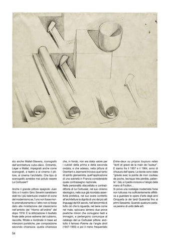 sto anche Mallet-Stevens, iconografo dell’architettura cubo-déco. Entrambi, Léger e Mallet, impegnati anche come scenografi, a teatro e al cinema il pittore, al cinema l’architetto. Che tipo di scenografo avrebbe mai potuto essere Le Corbusier? Anche il grande pittore spagnolo Juan Gris e il nostro Gino Severini sarebbero stati tra i più talentuosi creatori di icone del modernismo se, l’uno non fosse morto prematuramente e l’altro non si fosse dato alla rivisitazione del classicismo nell’ambito del “ritorno all’ordine” del dopo 1918. È la stilizzazione il risultato finale delle prove estreme del cubismo, raccolte, filtrate e riordinate in base ad intenzioni puristiche, per composizione secondo chiarezza: quella chiarezza