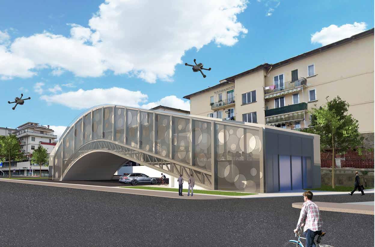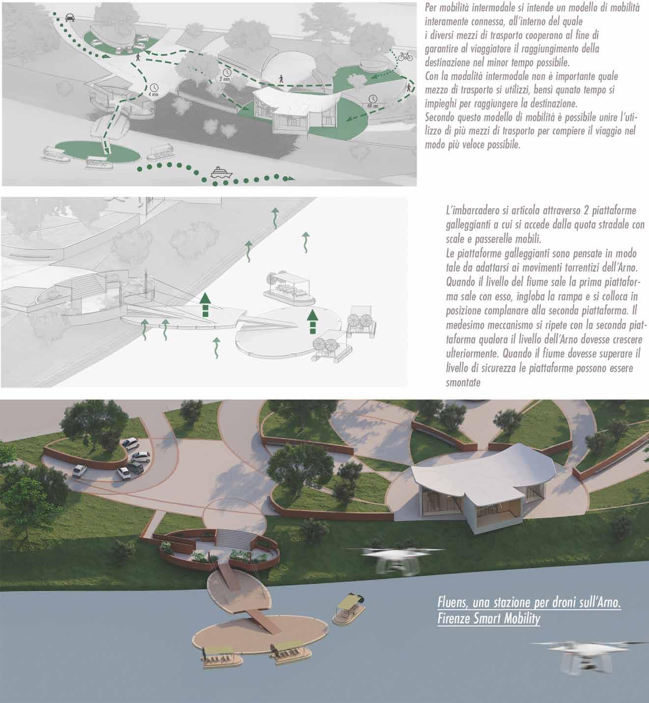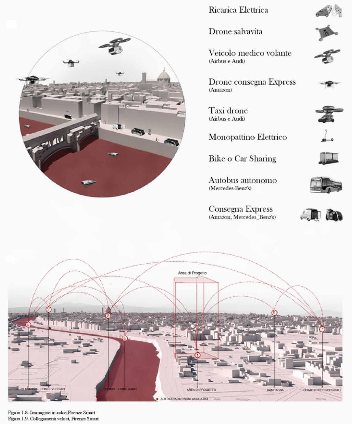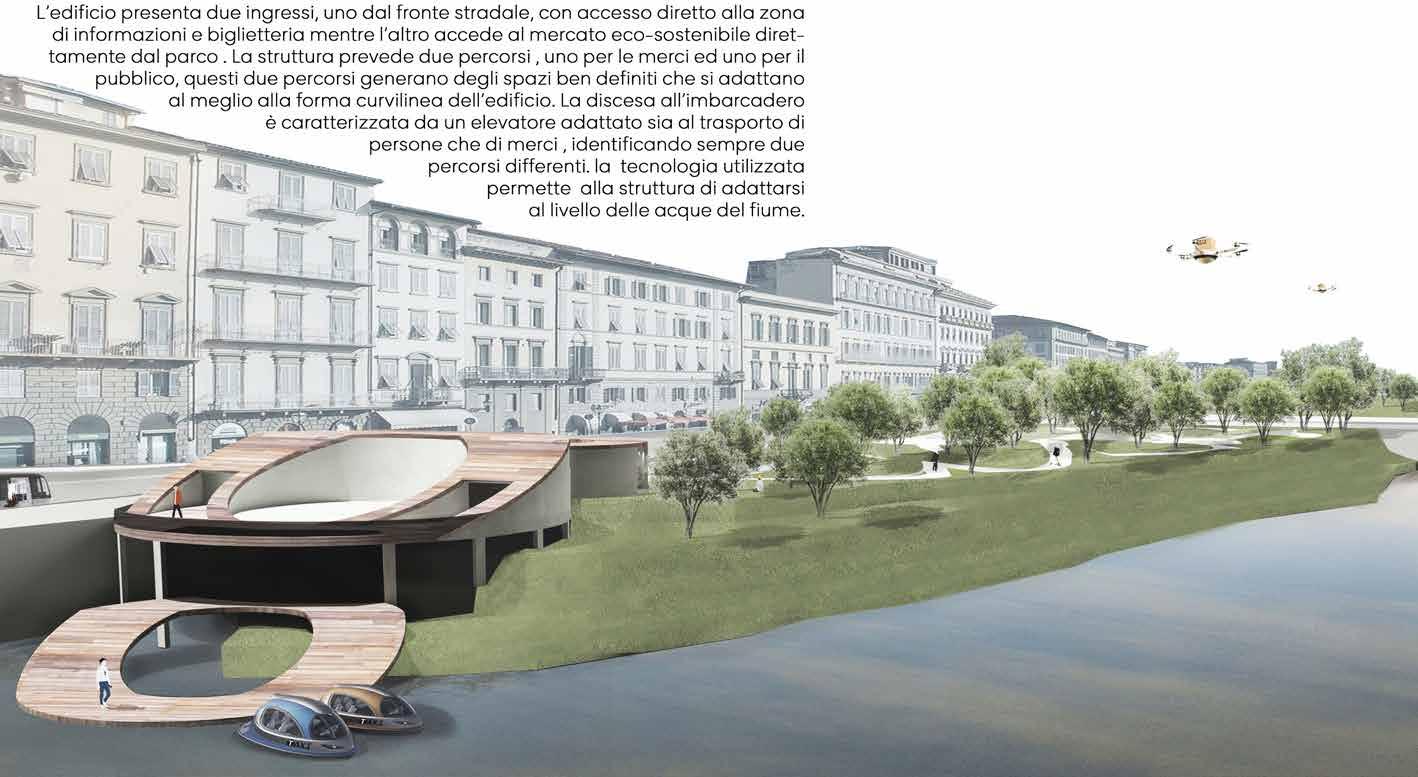 Infine, il corso dell’Arno potrebbe essere utilizzato per penetrare rapidamente nel tessuto più storico della città, per via d’acqua o con sorvoli radenti, per spostare turisti e merci, senza interferire con la delicatezza della densità storico-monumentale.