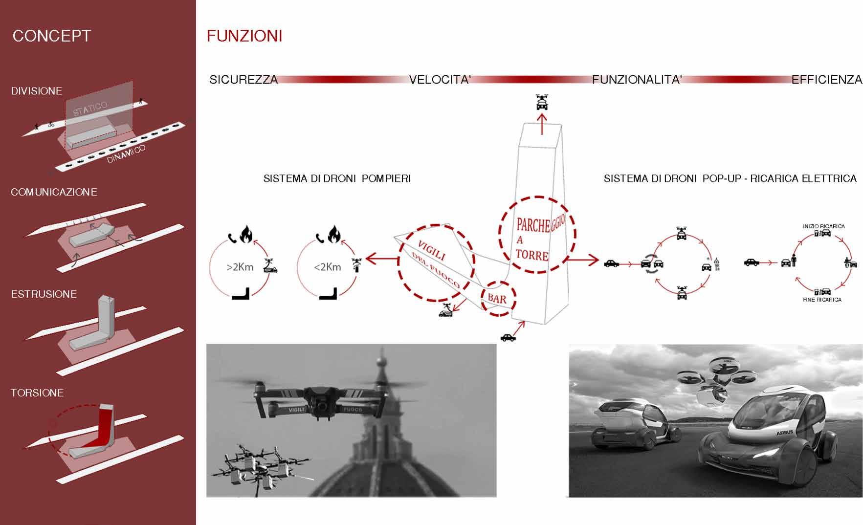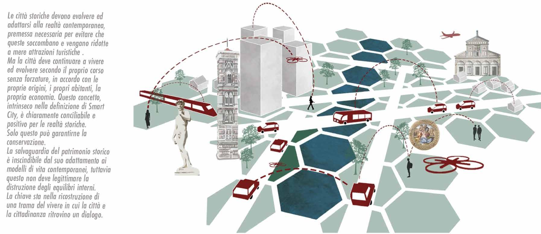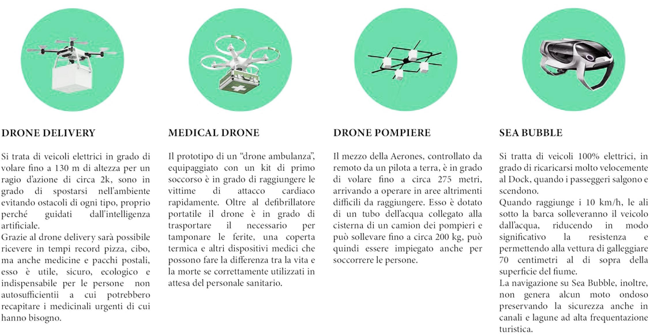 Infine, il corso dell’Arno potrebbe essere utilizzato per penetrare rapidamente nel tessuto più storico della città, per via d’acqua o con sorvoli radenti, per spostare turisti e merci, senza interferire con la delicatezza della densità storico-monumentale.