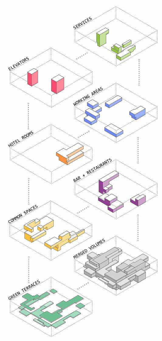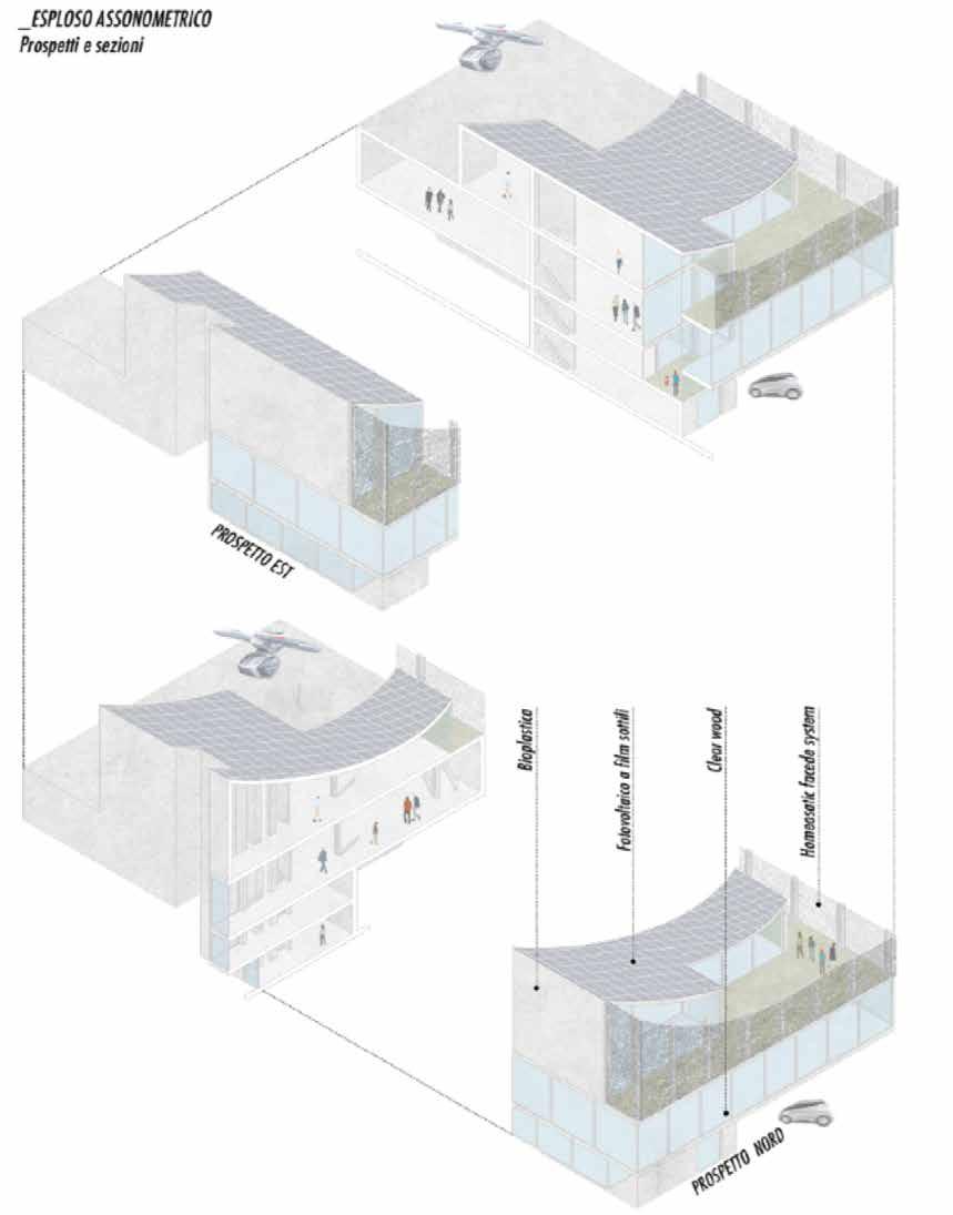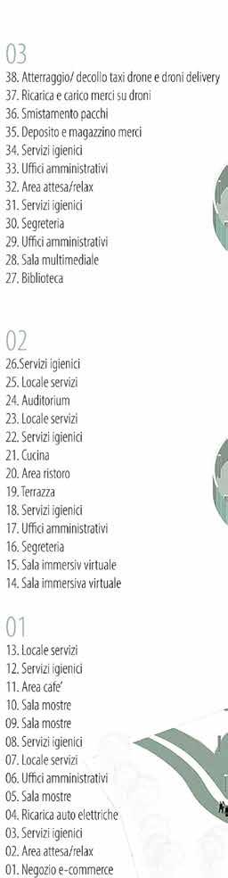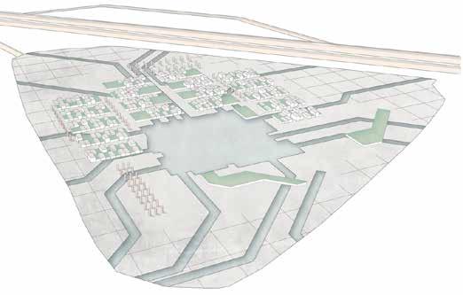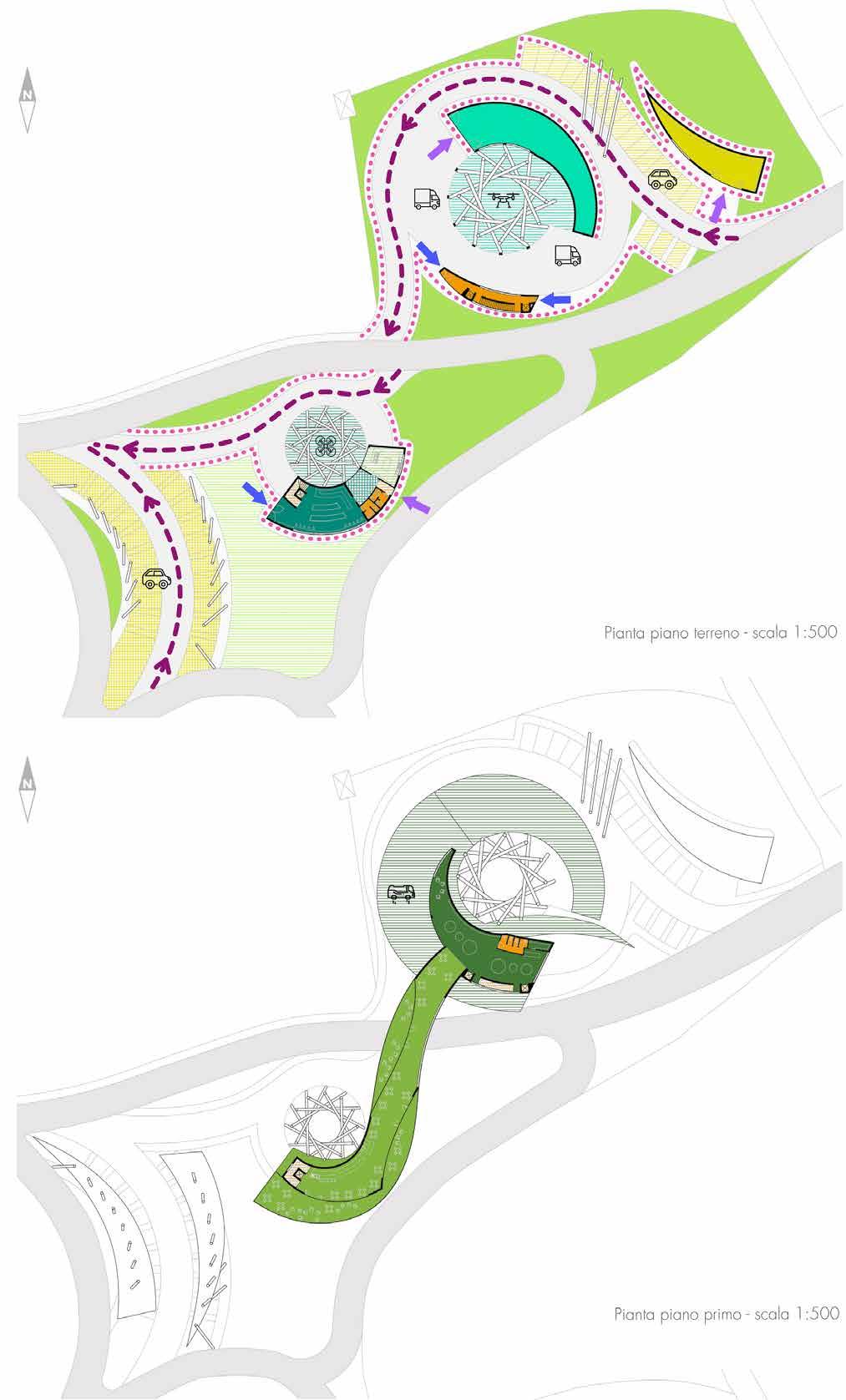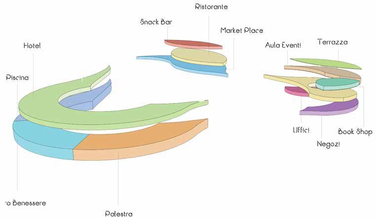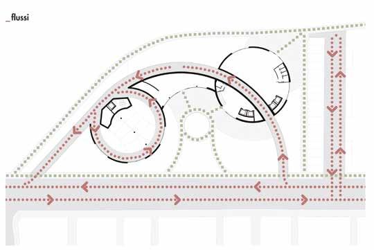 soluzioni adottate sono andate nella direzione di rinuncia a tale accostamento per approcciare soluzioni di grande frammentazione volumetrica e la ricerca di una sintonia ambientale. Si tratta pertanto di installazioni che organizzano un tessuto assai minuto, che tenta di intrecciarsi con i macro-segni dell’impronta della mega-struttura, nel tentativo di risarcirne la violenza imposta.