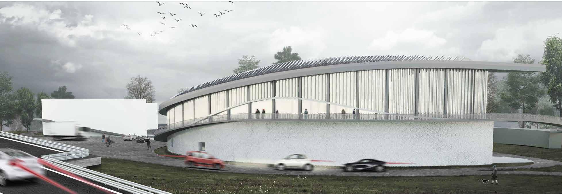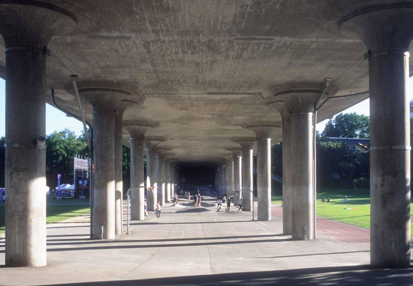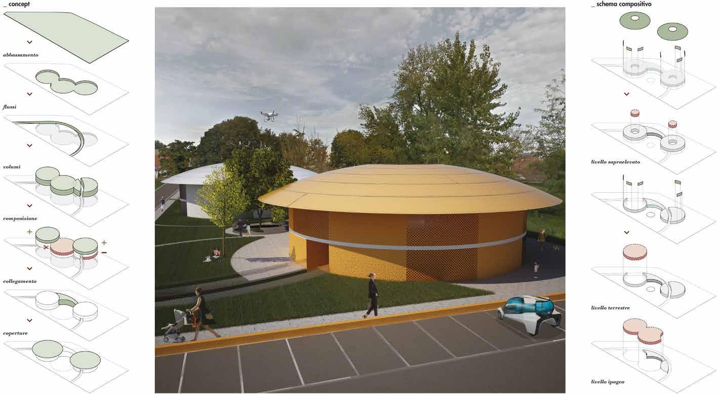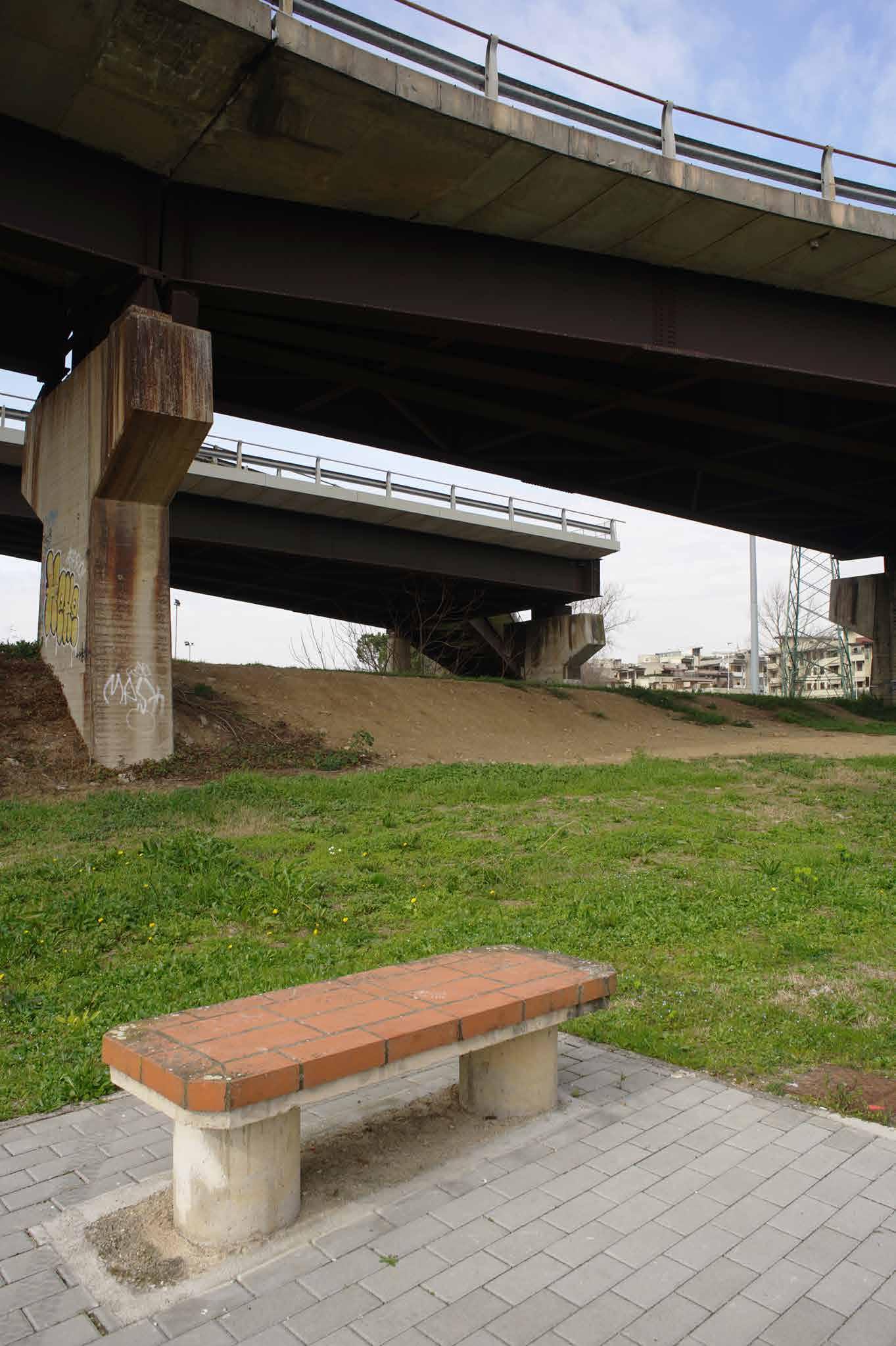 La ri-progettazione di quest’area attrezzata si è dovuta confrontare primariamente con il “gigantismo” dell’infrastruttura del ponte, che domina anche dall’alto l’intera zona, pertanto le