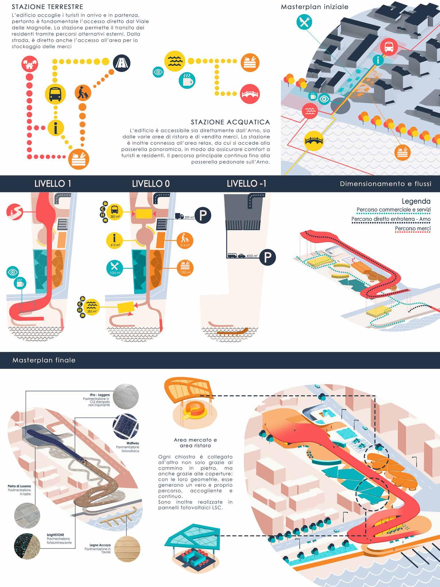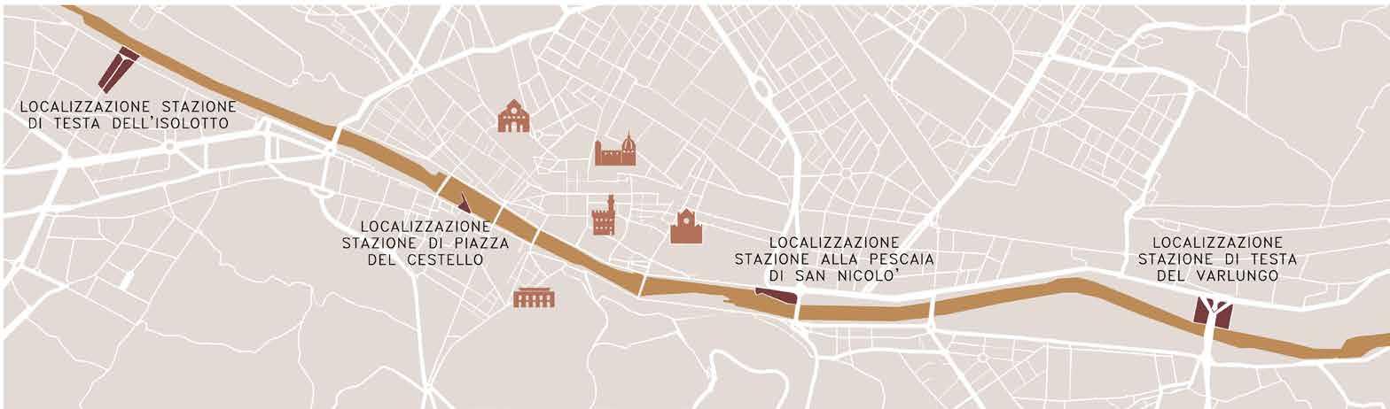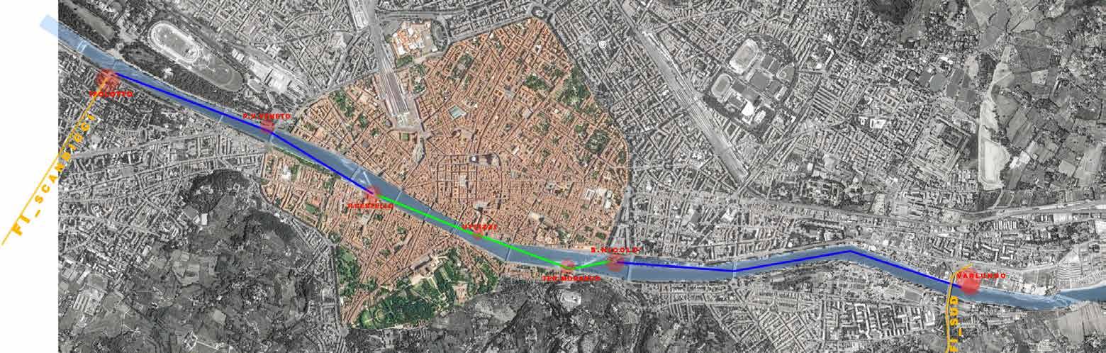 lo con il casello autostradale di Firenze Sud, poco prima dello sbarramento della Pescaia di Sant’Andrea a Rovezzano. Questo punto scambiatore potrebbe utilizzare parte dello stabilimento industriale riconvertito, posto sul terrazzamento fluviale, e le aree poste nello svincolo delle rampe di salita/discesa del ponte del Varlungo, per costituire una stazione di terra e di fiume, per poter interscambiare i flussi di persone e merci provenienti dalla A1 e proseguire verso il centro cittadino con sistemi di navigazione automatizzata.