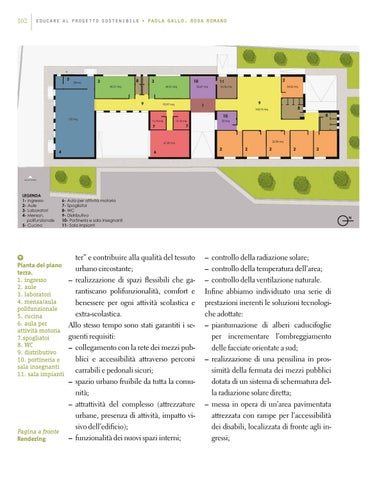ter” e contribuire alla qualità del tessuto urbano circostante; –– realizzazione di spazi flessibili che garantiscano polifunzionalità, comfort e benessere per ogni attività scolastica e extra-scolastica. Allo stesso tempo sono stati garantiti i seguenti requisiti: –– collegamento con la rete dei mezzi pubblici e accessibilità attraverso percorsi carrabili e pedonali sicuri; –– spazio urbano fruibile da tutta la comunità; –– attrattività del complesso (attrezzature urbane, presenza di attività, impatto visivo dell’edificio); –– funzionalità dei nuovi spazi interni;