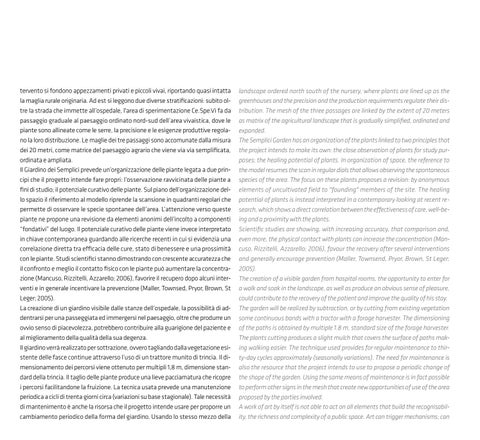 tervento si fondono appezzamenti privati e piccoli vivai, riportando quasi intatta la maglia rurale originaria. Ad est si leggono due diverse stratificazioni: subito oltre la strada che immette all’ospedale, l'area di sperimentazione Ce.Spe.Vi fa da passaggio graduale al paesaggio ordinato nord-sud dell’area vivaistica, dove le piante sono allineate come le serre, la precisione e le esigenze produttive regolano la loro distribuzione. Le maglie dei tre passaggi sono accomunate dalla misura dei 20 metri, come matrice del paesaggio agrario che viene via via semplificata, ordinata e ampliata. Il Giardino dei Semplici prevede un’organizzazione delle piante legata a due principi che il progetto intende fare propri: l’osservazione ravvicinata delle piante a fini di studio; il potenziale curativo delle piante. Sul piano dell’organizzazione dello spazio il riferimento al modello riprende la scansione in quadranti regolari che permette di osservare le specie spontanee dell’area. L’attenzione verso queste piante ne propone una revisione da elementi anonimi dell’incolto a componenti “fondativi” del luogo. Il potenziale curativo delle piante viene invece interpretato in chiave contemporanea guardando alle ricerche recenti in cui si evidenzia una correlazione diretta tra efficacia delle cure, stato di benessere e una prossimità con le piante. Studi scientifici stanno dimostrando con crescente accuratezza che il confronto e meglio il contatto fisico con le piante può aumentare la concentrazione (Mancuso, Rizzitelli, Azzarello; 2006), favorire il recupero dopo alcuni interventi e in generale incentivare la prevenzione (Maller, Townsed, Pryor, Brown, St Leger; 2005). La creazione di un giardino visibile dalle stanze dell’ospedale, la possibilità di addentrarsi per una passeggiata ed immergersi nel paesaggio, oltre che produrre un ovvio senso di piacevolezza, potrebbero contribuire alla guarigione del paziente e al miglioramento della qualità della sua degenza. Il giardino verrà realizzato per sottrazione, ovvero tagliando dalla vegetazione esistente delle fasce continue attraverso l’uso di un trattore munito di trincia. Il dimensionamento dei percorsi viene ottenuto per multipli 1,8 m, dimensione standard della trincia. Il taglio delle piante produce una lieve pacciamatura che ricopre i percorsi facilitandone la fruizione. La tecnica usata prevede una manutenzione periodica a cicli di trenta giorni circa (variazioni su base stagionale). Tale necessità di mantenimento è anche la risorsa che il progetto intende usare per proporre un cambiamento periodico della forma del giardino. Usando lo stesso mezzo della