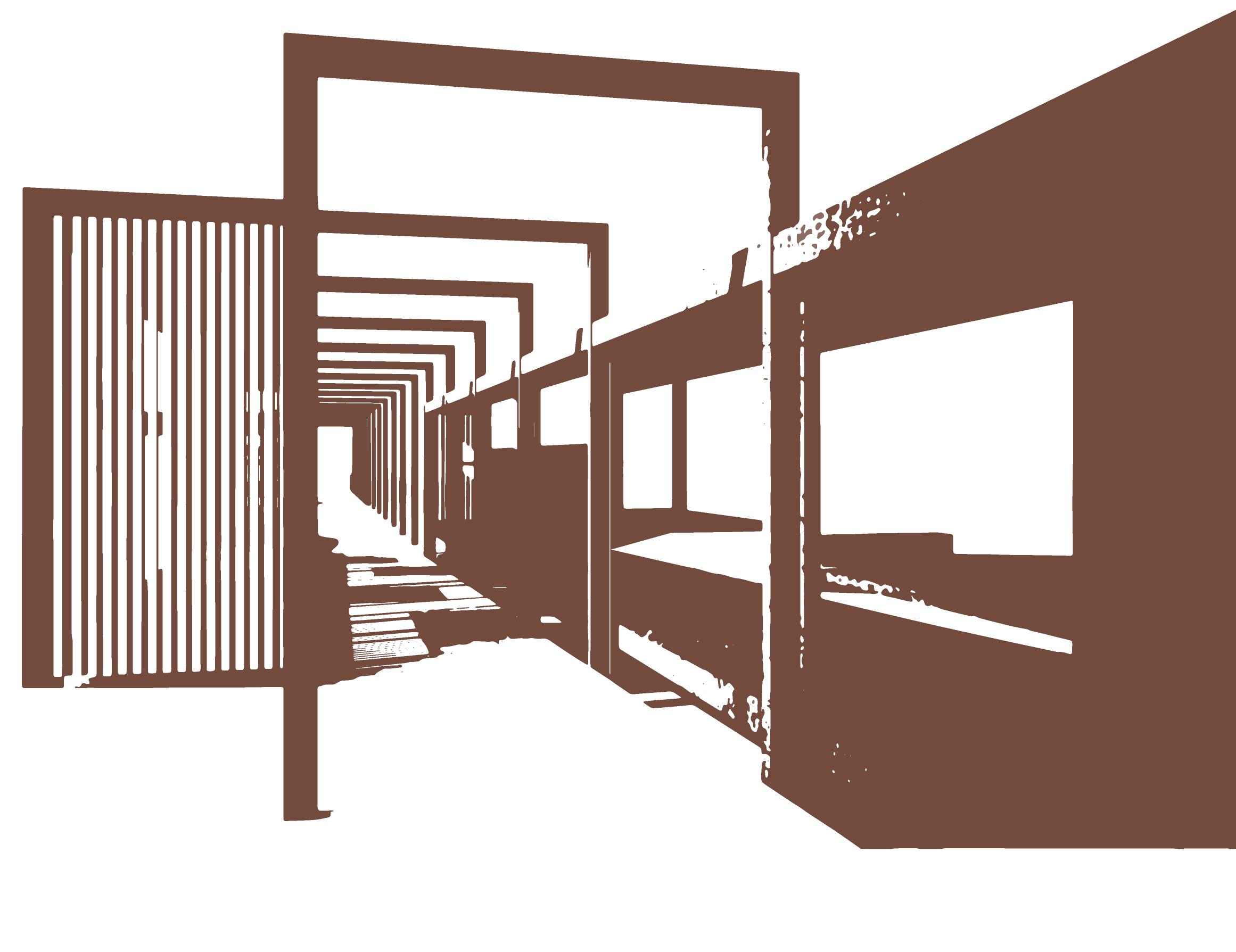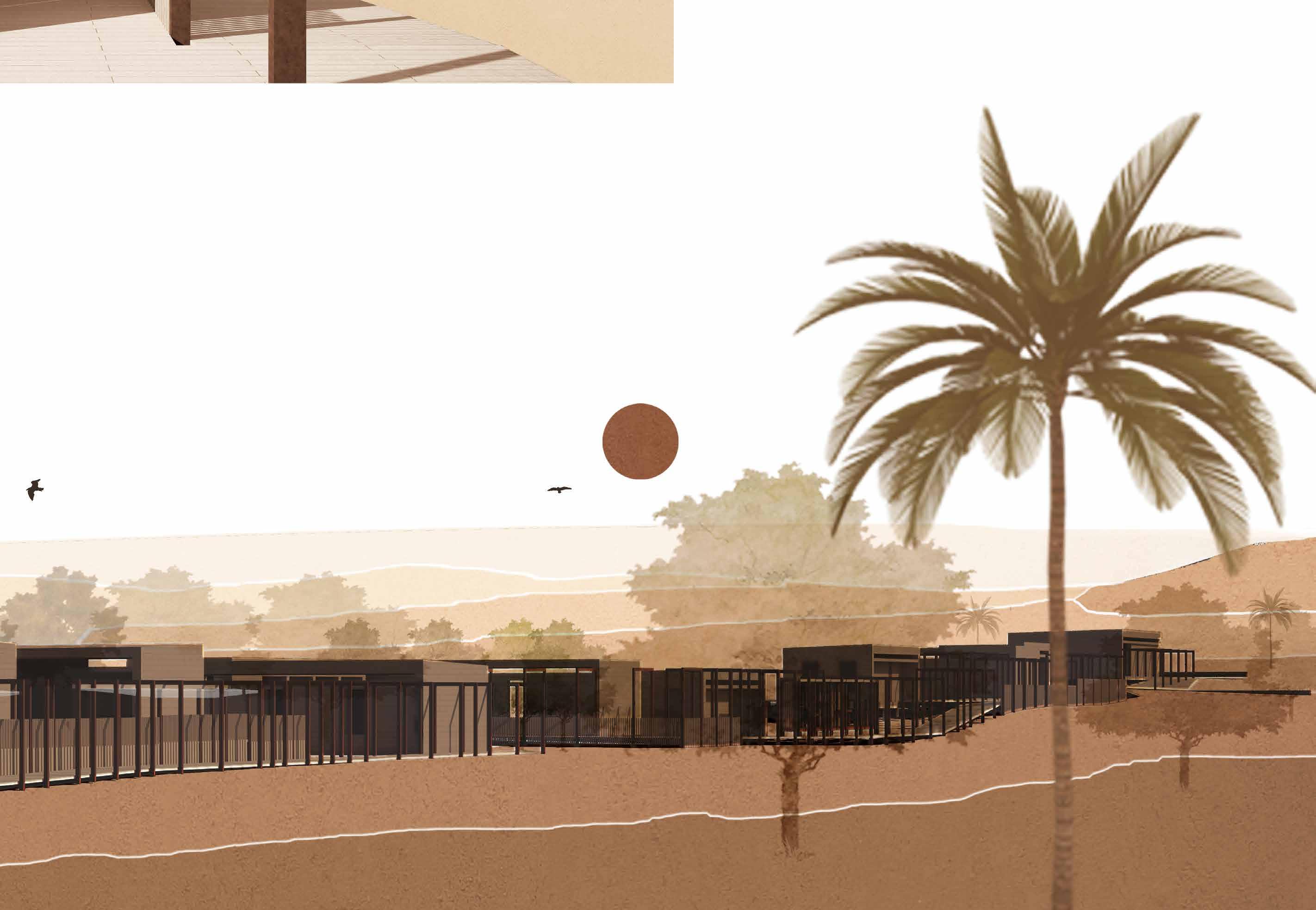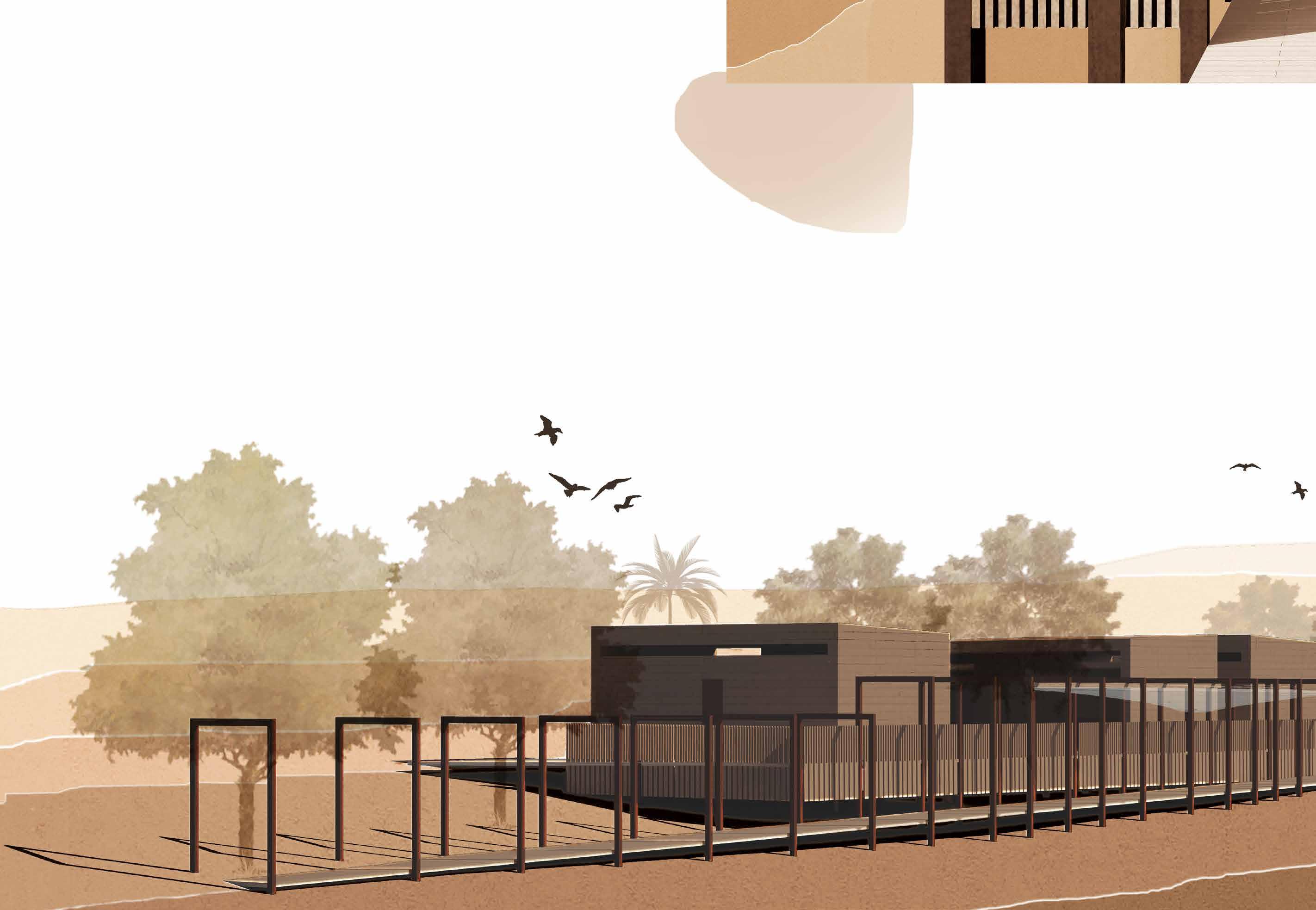 L’estremità superiore della biforcazione dell’asse è invece adibita all’alloggio per i ricercatori, gli archeologi o per gli studenti universitari che vogliono svolgere attività di studio e di ricerca nel sito. I moduli abitativi si dispongono a