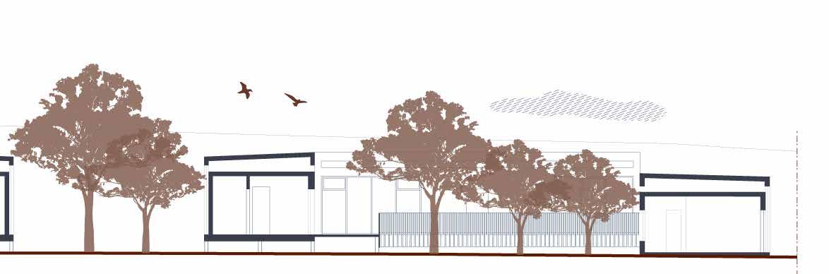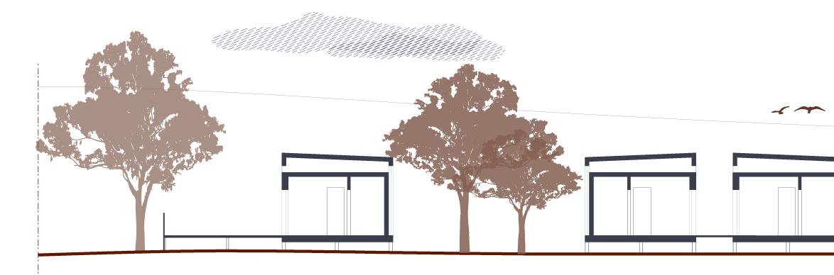 due a due definendo un’area verde di intramezzo che li separa. Arrivando da est e percorrendo il percorso pergolato, le abitazioni sono precedute da un corpo di fabbrica più grande con vari spazi comuni.