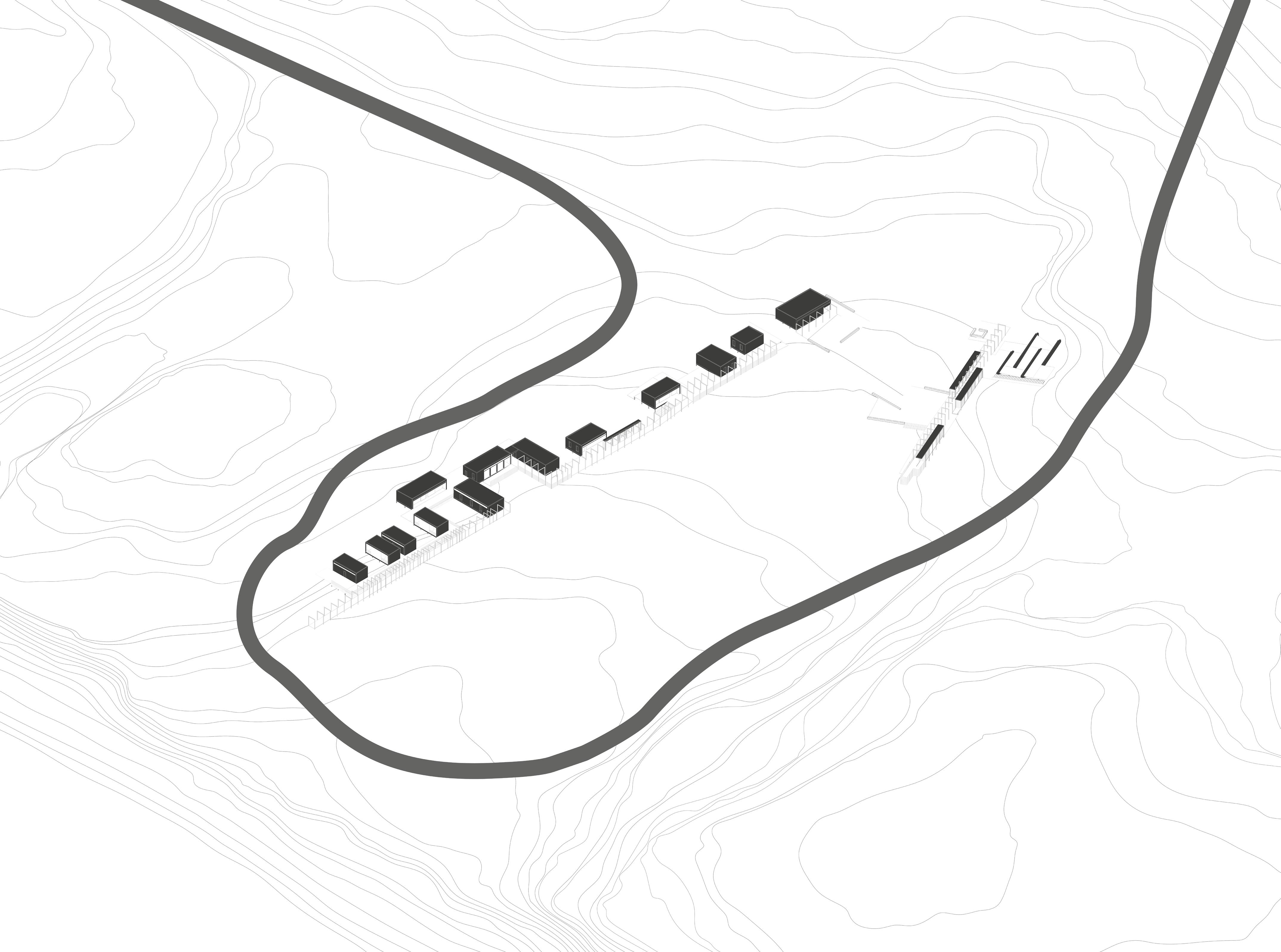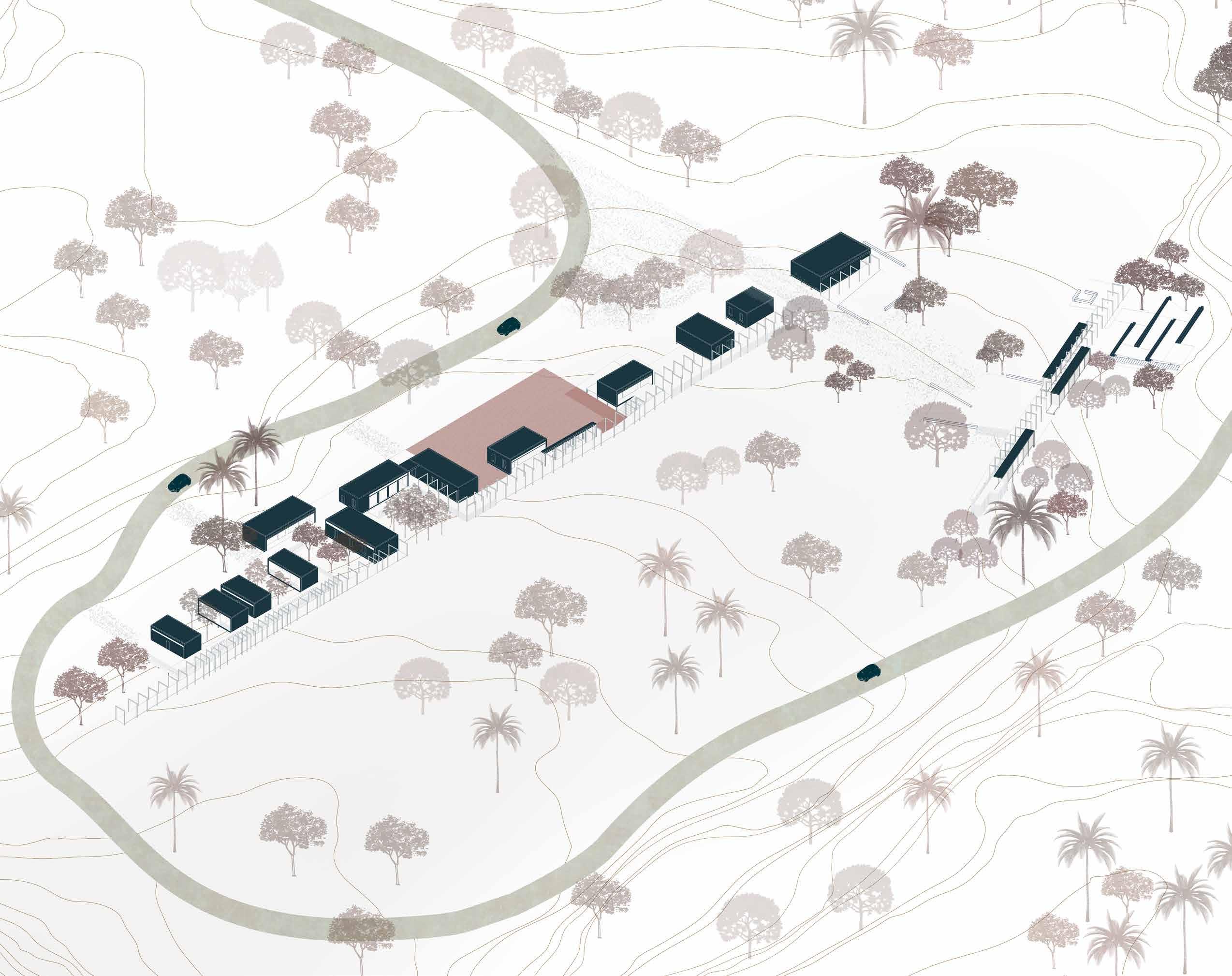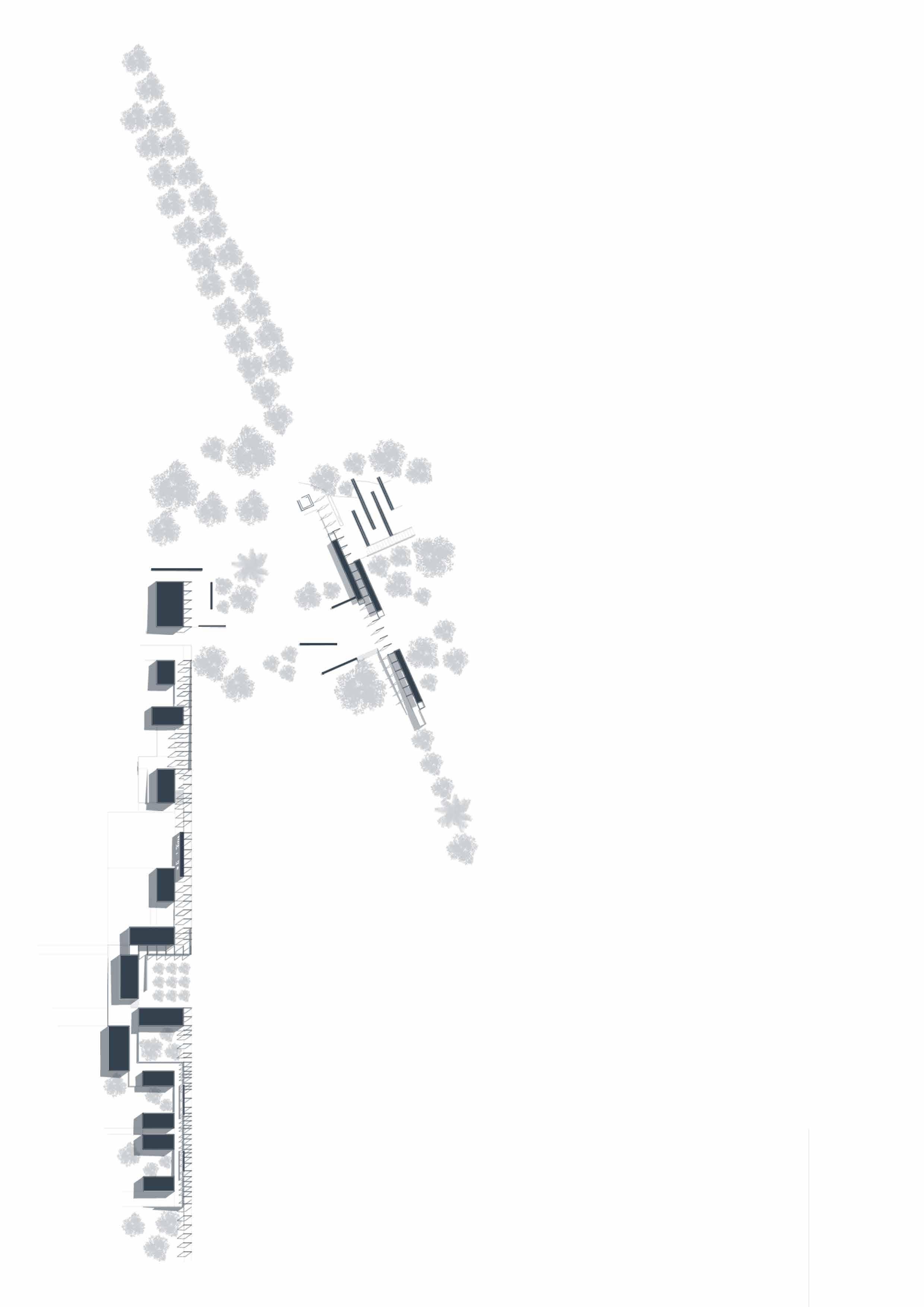 by two defining a green area between them and are preceded by a larger building with various common areas. The natural difference in height of the terrain allows for visual closeness and volumetric integrity, but at the same time maintains the privacy of the residences by separating the fluxes of tourists from those who work and study on the site.