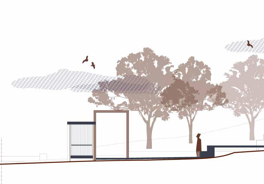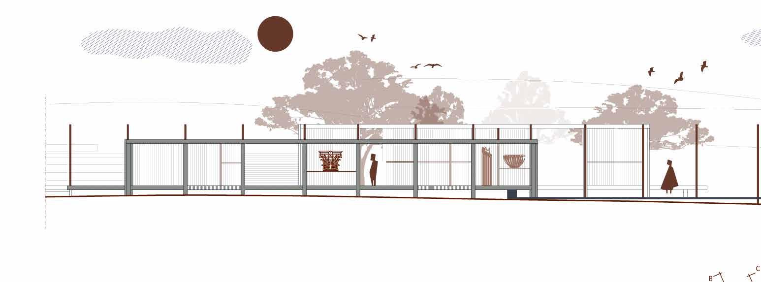 have the necessary spaces, but also to interact within a single system, that is, capable of facilitating situations of exchange and sharing between the various areas. The research sites at the service of archaeological excavation activity are contiguous with the routes of a varied tourist flow: on the one hand, scholars and archaeologists can carry out their work without having to isolate themselves within a ‘museum’, and on the other hand, every visitor to the park, whether camper, sunbather or sportsman, is inevitably involved in the cultural offer of the site, that is, the visual enjoyment of the finds in storage, without ever having to perform the act of entering a ‘museum’. The question does not so much concern the physicality of the designed spaces as the relations of a system that the project structures in terms of an ideal recovery of the ‘urban’ memory of the ancient site, even if from the perspective of the fragment.