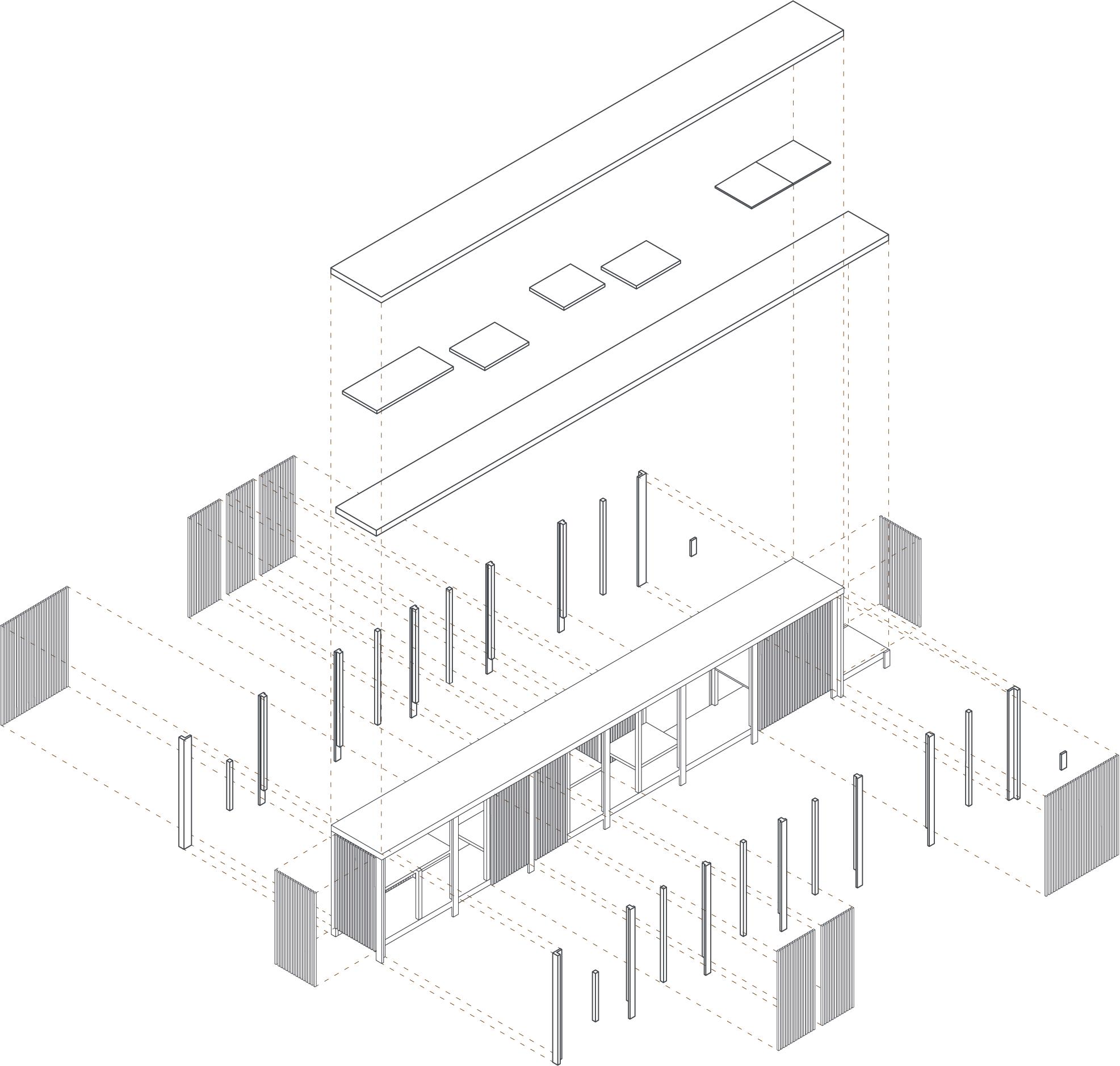 Esploso assonometrico delle teche espositive. | Axonometric exploded view of the project.
