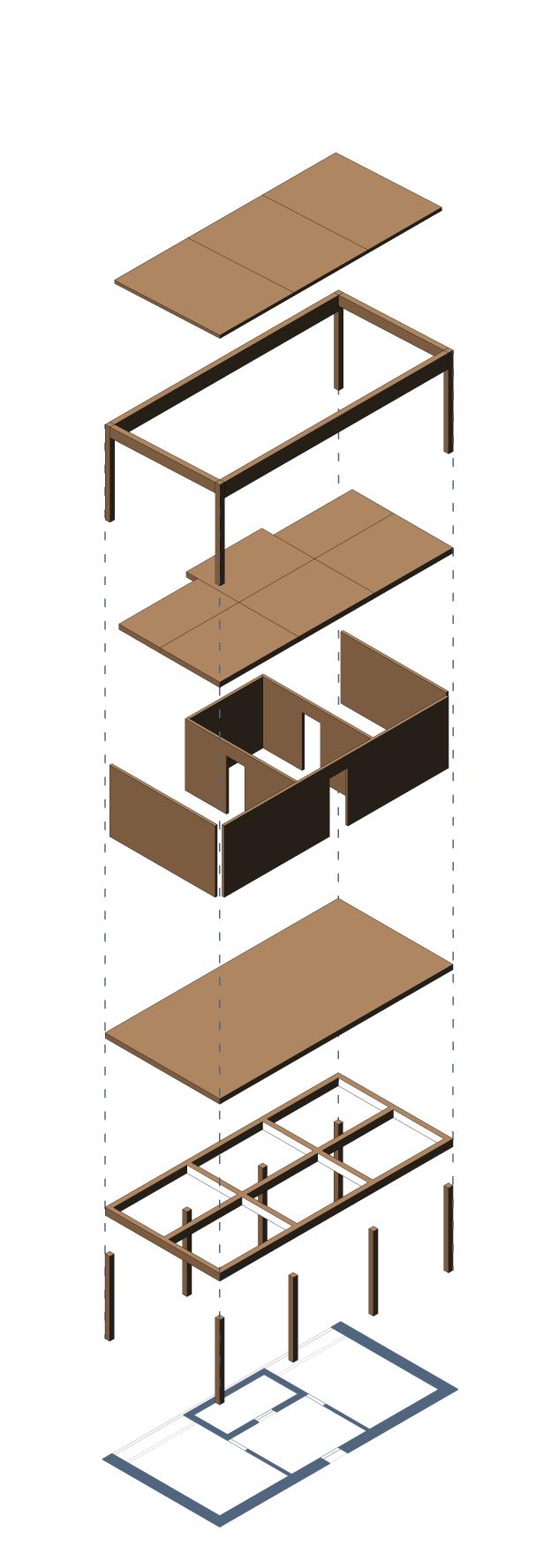The housing module has been studied in detail both in plan and on a technological-constructive level, thus defining a basic model that is potentially repeatable and reusable in different contexts. The structure of the building is a hybrid: a load-bearing framework of lamellar wood beams and columns buffered by xlam partitions that