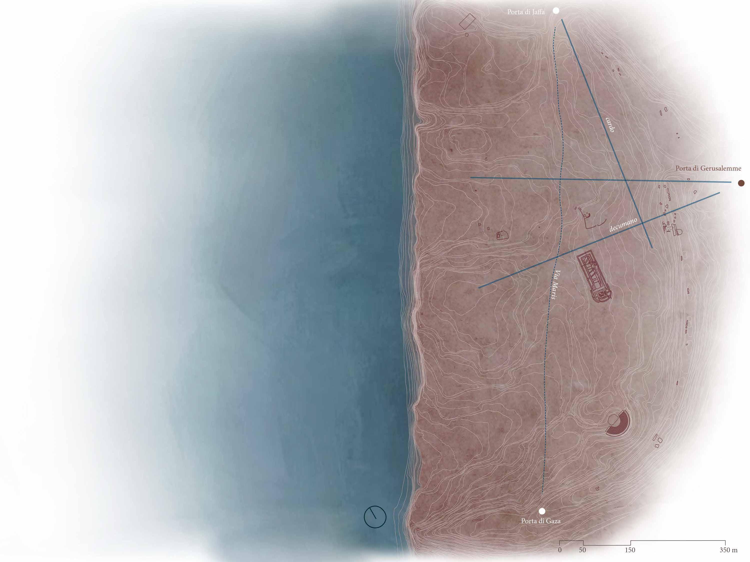 Obviously there is a planimetric/altimetrical dimension with which any project cannot be confronted, on pain of its irrelevance and ineffectuality, but the “place” embodies above all the idea of that design continuity which becomes in fact the qualifying factor of a figurative recognisability of the site itself. Being implemented in the site through history, . In such narrative stratification, the memory of what has been can dwell alongside the developments of what, plausibly, could have been. It therefore seems legitimate that, outside of any ascertained archaeological “truth”, the project “invents” its own figurative reasons within a plausible, indeed objectively very probable, memory, such as the partial representation of Roman-Byzantine Ashkelon found in the mosaic map of Madaba. In the fragment of that mosaic, unfortunately mutilated, two porticoed decumans branch off from the Jerusalem Gate, one descending towards the sea, the other ascending towards the southern tell. The idea of order that structured the ancient city defines a spatial matrix that, today, can also structure the planimetric layout of the project within a precise urban “will”. It is as strong in affirming the necessity of the ordering gesture as it is simultaneously aware of the impossibility of giving it fulfilment. The “new” decumani are “ancient” figurative tools that connect the complexity and ambiguity of the site, drawing, beyond any formal mimesis, the recognisability of the place. They create the conditions for the different functional instances included in the project programme not only to