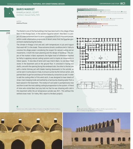 The Market is one of the few buildings that have been built in the village of New Bariz in the Kharga Oasis, in the western Egyptian desert. New Bariz is a project of a new settlement born to serve a population of 5 to 10 thousand people, within a wide urbanisation programme of desert areas that the Egyptian government started during the Sixties. The climate in Kharga is hot and arid, with temperatures in July and August that reach 48°C in the shade. These extreme climatic conditions led H. Fathy to conceive the village project considering the respect for natural cooling and air movements, in both the town planning and the design of buildings. The project of the market in Bariz represents the higher level of refinement reached by Fathy in applying natural cooling systems and to inspire air movements in indoor spaces. “A new idea of wind catch was tried in Bariz, to cool down food stores in the basement and on the ground floor. It consisted in having two shafts, one with the opening facing the windward side, the other to the lee side with a metal chimney pot with blades leaning downwards to the outside, as can be seen in some places in Italy, to ensure suction by the Venturi action, and painted black to get hot and draw air from below by convection as well. In order to add the cooling effect of this wind catch, it was designed to have sheets of straw-mats hanging inside and wetted by a hand pump drawing water from a basin placed in the basement. The residue of cool water is pumped every now and then to wet the mats adding cooling by evaporation to the system. A friend of mine who visited Bariz last July told me that he was shivering with cold in this basement while the air temperature outside was 46°C. This without the wetted straw-mats” (H. Fathy, 1963, report to the Bariz project).
