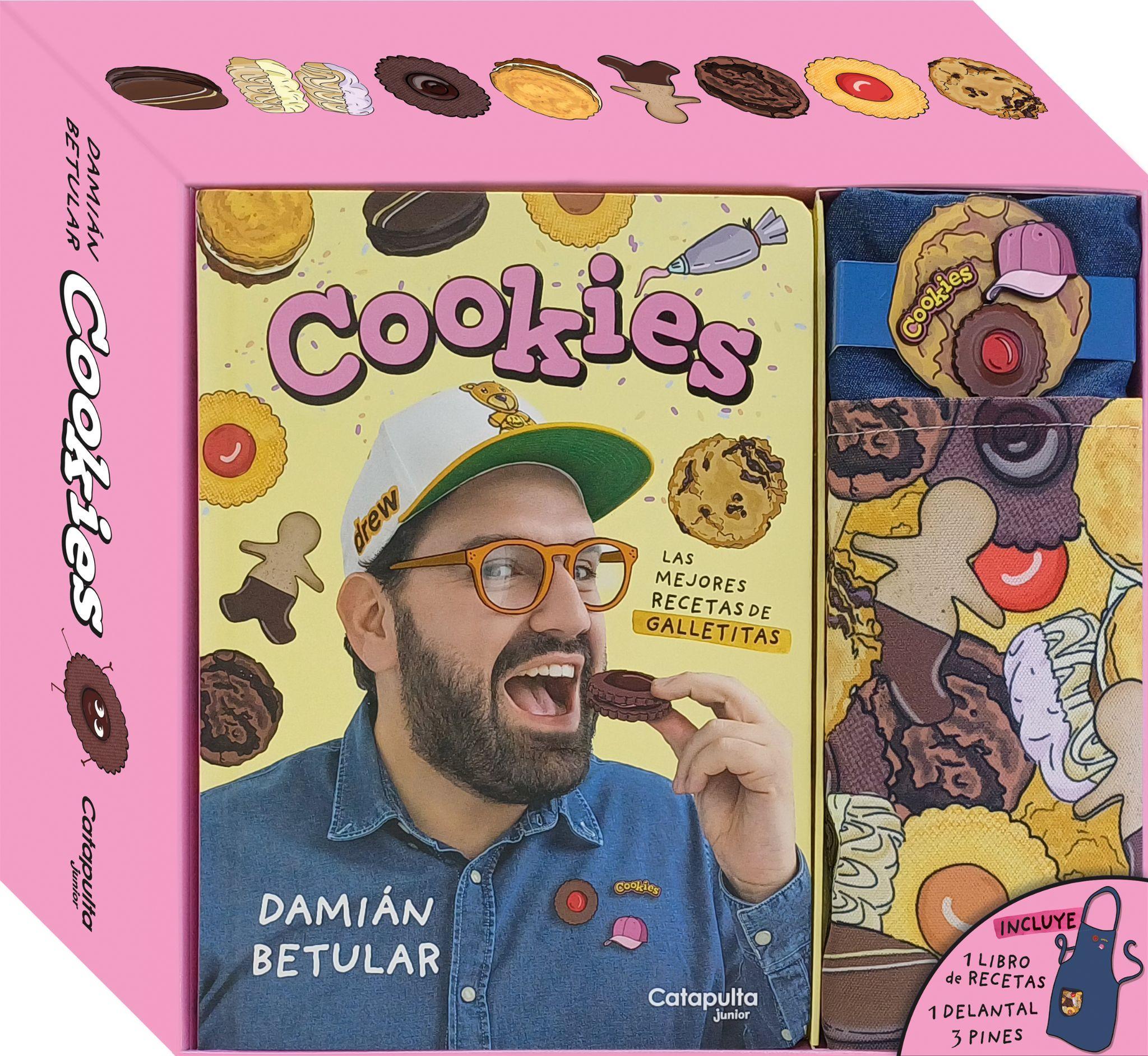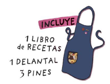Vas a encontrar la historia de la pastelería, jue os divertidísimos, muchos tips undamentales a la hora de hacer las recetas y, además, re alos espectaculares: un delantal de cocina y tres pines para que seas parte del abuloso equipo de Betular.