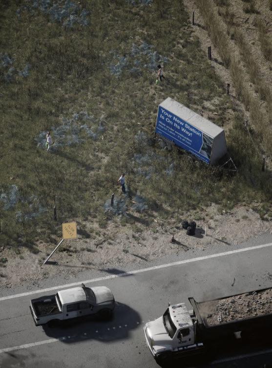 A woman and two men stare into the boot of a parked white car. Through perfect Euclidean eyes hovering overhead, they observe a Dennis Family development with houses at every stage of completion: erected with an AstroTurf front yard, an empty shell, a timber frame, a concrete slab, a pile of dark soil framed by kerbs, a fresh timber fence, open fields of grass.