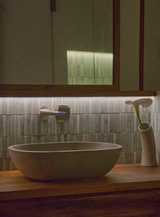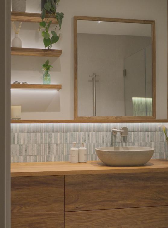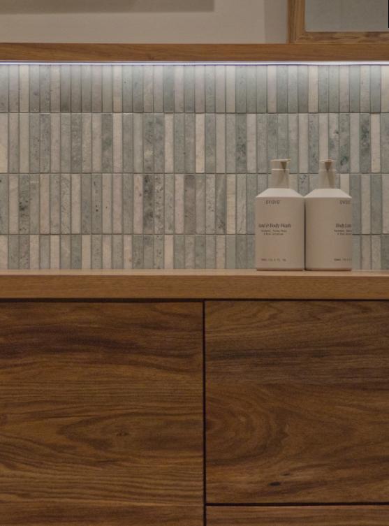 Natural stone green finger tiles wrap around the shallow wall and seat, creating a sense of separation while emphasising both horizontal and vertical dimensions, making the space feel larger. Custom Australian Blackwood joinery, with its rich and warm brown tones, contrasts beautifully with the tiles, seamlessly tying all elements together.