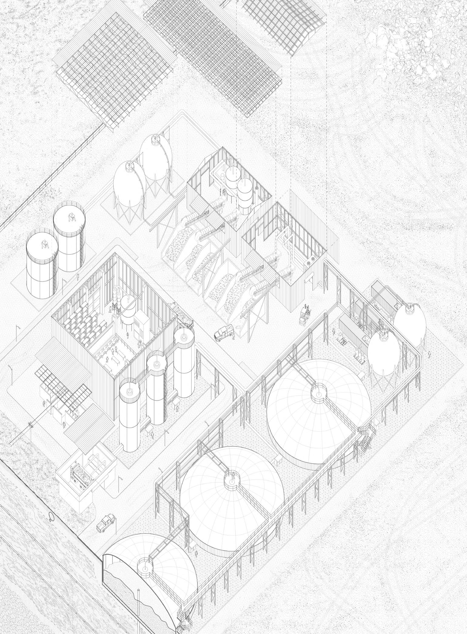 The quarry if the site for our grasslands rehabilitation methodology, comprising an anaerobic digester, a servo, and the connecting infrastructure between and beyond.