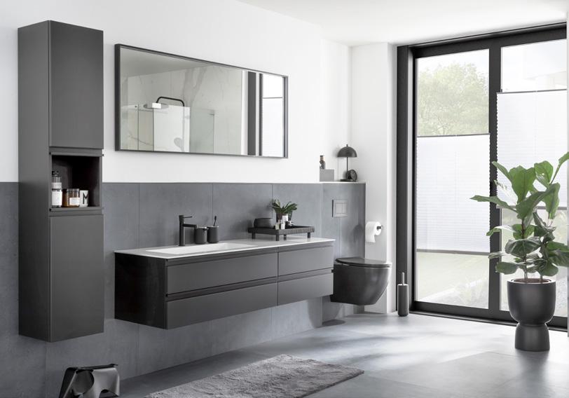 BADMÖBEL-SET BILBAO Dekor Cosmos grey.Griffleisten mattschwarz. Bestehend aus: Mineralguss-Waschtisch, Waschtischunterschrank, B 151 × T 50 × H 41 cm, Spiegel mit LED-Alurahmen in schwarz matt. 429.-