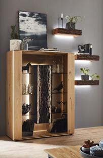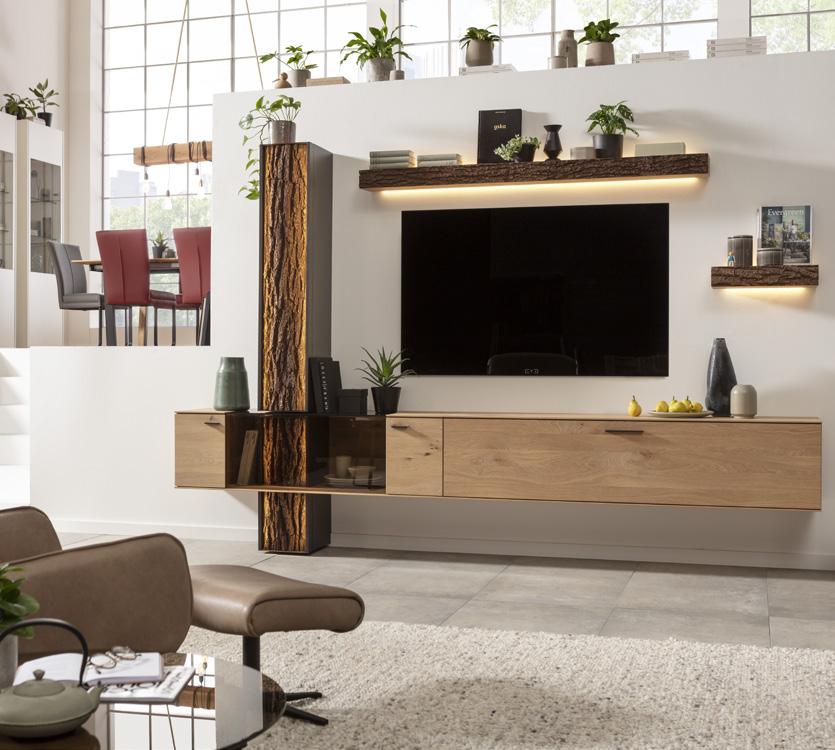 Wohnkombination, in der Ausführung Kerneiche natur massiv, Oberfläche gebürstet mit Absetzungen in echtem Rindenholz, Metall anthrazit. Beleuchtung gegen Mehrpreis erhältlich. Ca. 265x213x49/20 cm, 71160096.
