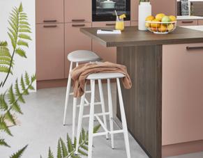 Nobilia-Einbauküche aus dem Programm Senso, Zeile und Insel Lack koralle Premium matt, Nischenverkleidung und Ansetztheke Walnuss natur Nachbildung, Arbeitsplatten Terrazzo weiß Nachbildung. Mit hochwertigen AEG-Elektrogeräten und Einbauspüle. Maße ca. 401 + 240 + 40 cm (Theke).