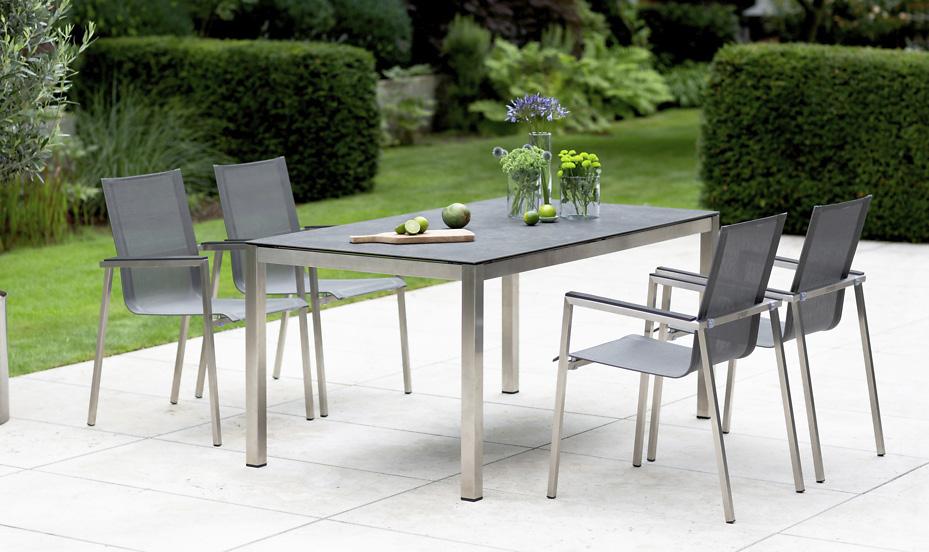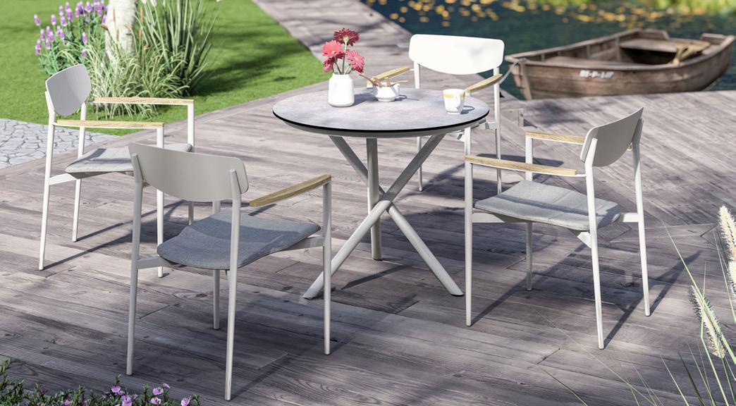 Stuhl, Bezug Sunproof Fontelina nature, Aluminiumgestell light taupe pulverbesch.Armlehnen Teak. 71950219 289.Tischgestell, 3-Bein-Aluminiumgestell light taupe pulverbeschichtet. 7195015501 419.-