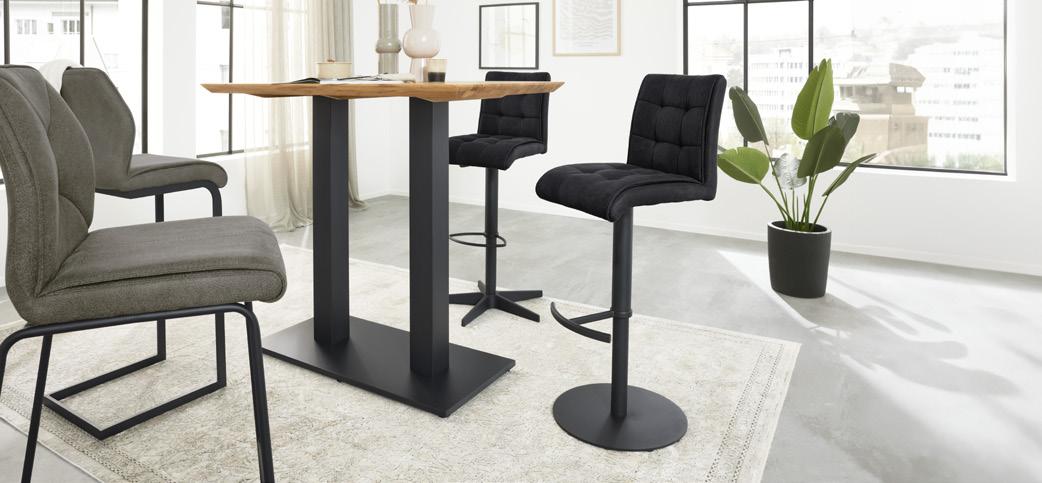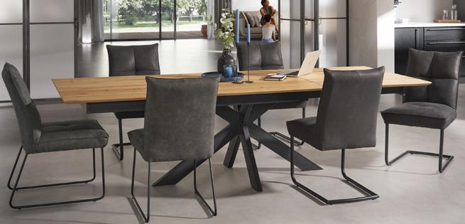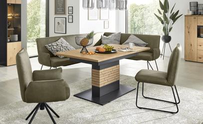 Modernes Speisezimmer, Bank/ Eckbankgruppe in Bezug Stoff, wahlweise Leder, Bank ca. 200 cm 1399.- | Esstisch Platte Eiche massiv, Gestell Eisen schwarz, ca. 200x100 cm. 12731165 | Armlehnstuhl 499.- optional mit Drehfunktion. 11160007 /-01 /-02 Stuhl