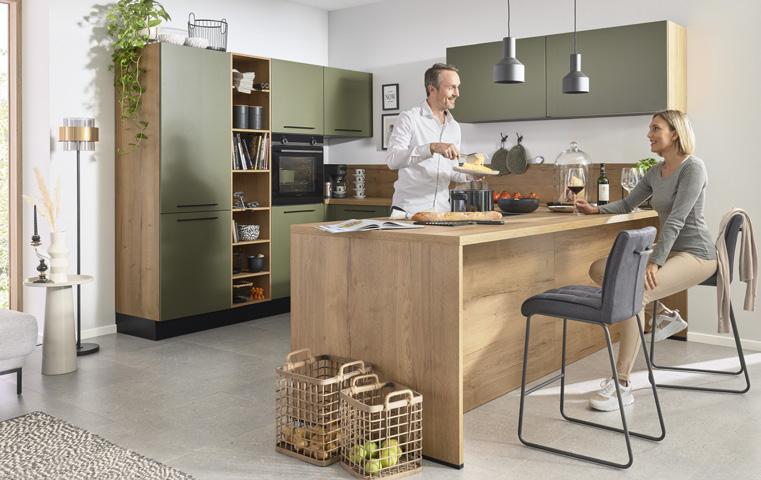 Interliving Küche Serie 3065, Front olive, Regal, Nischenverkleidung, Thekenelement, Wangen und Arbeitsplatten Eiche Ventura Nachbildung, best. aus Küche in U-Form mit Esstheke und Hängern. Ausgestattet mit Siemens-Elektrogeräten, exklusiver Einbauspüle und Armatur. Maße ca. 225x350x278 cm.