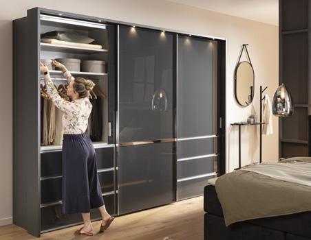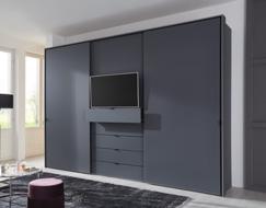Schwebetürenschrank, 3 Türen - 6 Schubkästen, Front Glas graphit, BxHxT 300x236x67 cm Passepartout und Beleuchtung optional. 75340409