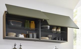 Die Hängeschränke mit Lifttüren lassen sich platzsparend bedienen.