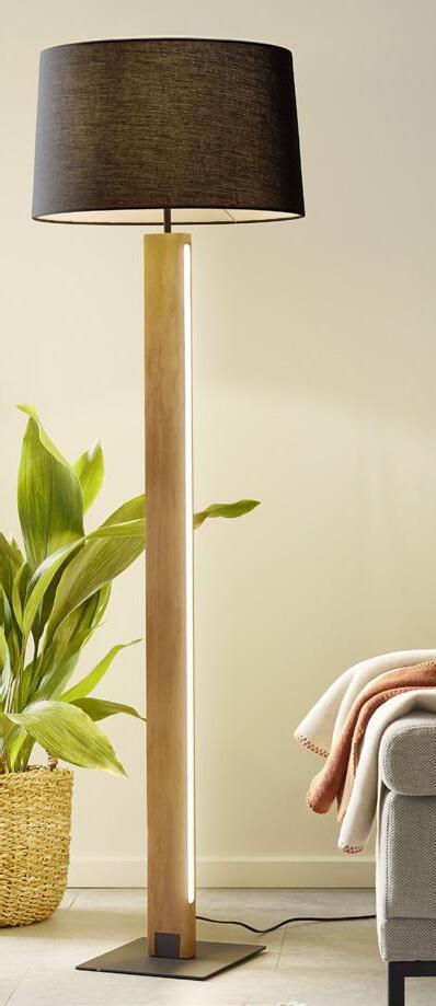 Interliving Leuchten Serie 9349 - Stehleuchte, Ø/H ca. 28/160 cm. Fuß Metall schwarz matt/Holz natur/Stoffschirm schwarz, Leinenstoff mit einem PVC Kunststoffträger, 1x E27 max. 10W, getrennt schaltbar, ohne Leuchtmittel. Abgebildete Leuchtmittel nur Dekoration.