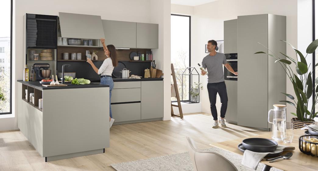 Interliving Küche Serie 3072, Front lava softmatt, Nischenverkleidung Nussbaum Kuba Nachbildung, Arbeitsplatten schwarz Pro, best. aus: L-Küche mit Jalousie-Aufsatzschrank, Hängern und separatem Hochschrankelement. Mit M IELE-Elektrogeräten, exklusiver Einbauspüle und Armatur. Maße ca. 247x311 + 123 cm.