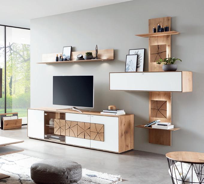 Wohnwand, Ausführung Kerneiche gebürstet mit Glasapplikaton Mattglas weiß, bestehend aus: Unterteil 4-türig, Wandpaneel, Regal-Element und Hängeelement, ca. 324x223x49 cm, LEDBeleuchtung gegen Mehrpreis erhältlich. 71160197