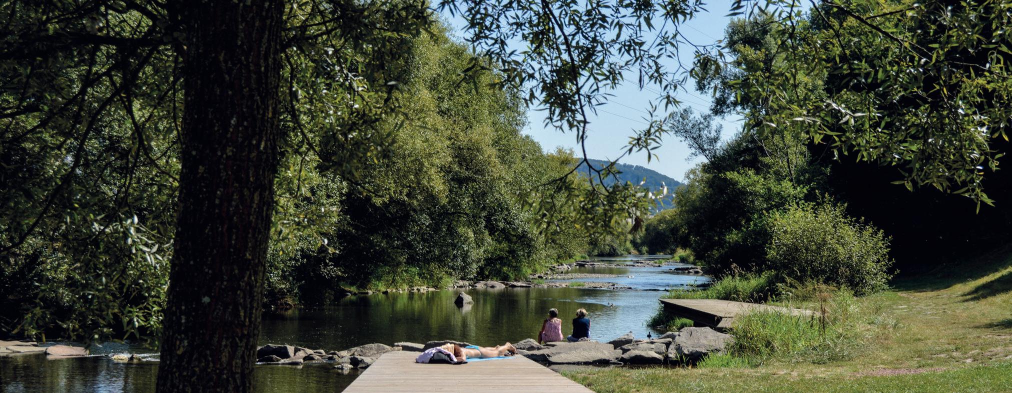 Auf dem Wiesentalradweg lässt es sich gemütlich von Basel ins Wiesental hinein bis hach Todtnau radeln. Wer möchte, kann entlang der insgesamt 53 Kilometer langen Strecke eine Reihe von Zwischenstopps für die Besichtigung von Sehenswürdigkeiten einlegen, zum Beispiel das Röttler Schloss bei Lörrach, die Altstadt von Schopfheim, das Hebelhaus in Hausen oder das Textilmuseum in Zell. Auch direkt am Fluss finden sich etliche Stellen für eine Rast (unser Foto zeigt den Wiese-Abschnitt bei Lörrach-Tüllingen). Den Rückweg nach Basel kann man ab Zell im Wiesental oder einer der darauf folgenden Stationen wie Hausen, Schopfheim, Maulburg oder Steinen bequem mit der S-Bahn S6 fahren. Dort ist die Fahrradmitnahme Montag bis Freitag (ausser zwischen 6 und 9 Uhr sowie Samstag und Sonntag) ganztägig kostenlos. Ausserhalb dieser Zeiten muss man für das Velo ein Ticket lösen. Infos zur Fahrradmitnahme im Zug unter www.sbb-deutschland.de.