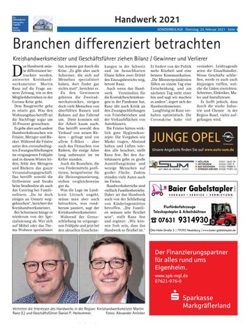kungen in der Schweiz und im benachbarten Elsass fallen zwei Drittel des Einzugsbereichs weg, betont Ranz. Auch wenn das Handwerk Verständnis für die Kontaktbeschränkungen in der Pandemie hat, Ranz übt auch Kritik an den Zwangsschließungen von Frisörbetrieben und der Verkaufsflächen von Autohäusern. Die Frisöre hätten wirklich gute Hygienekonzepte. Die Vorgaben wie Maske tragen, Abstand halten und Lüften würden alle beachtet, stellt Ranz fest. Bei den Autohäusern gebe es große Ausstellungräume und wenige Menschen auf großer Fläche. Zudem stünden viele Autos auch im Freien. Handwerksbetriebe sind vielfach Familienbetriebe. Daher sei das Handwerk auch von der Schließung von Kindertagesstätten betroffen. „Die Familien müssen sehr flexibel sein“, stellt Ranz fest und ergänzt: „Wir können froh sein, dass das Handwerk so flexibel ist.“