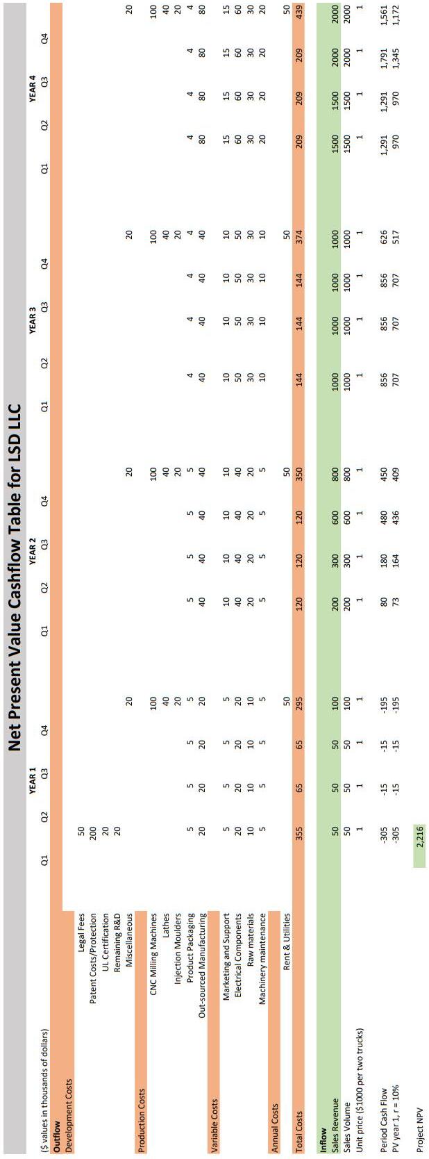 Admittedly,thetotalcostarrivedatisquitehigh.However,itisimportanttonotethatthe costfigureslistedabovearefortherawproductsthatwerecustommilledinthemachineshop.The hourswerecalculatedbasedonthetimeittookusatourexperienceleveltomaketheparts.With manufacturingprocesseslikeinjectionmolding(formorebasicparts)andmetallic3-Dprinting(for morecomplicatedpartslikethetulip),weprojectthatthelaborcosts,whichcurrentlyconstitute amajorpartofourincurredcosts,willbereducedsignificantly.We,thus,expectthemarket-ready per-truckcosttotalpricetobelowerthanthatstatedaboveifLSDstreamlinesthemanufacturing processandsupplychaintocutcosts.