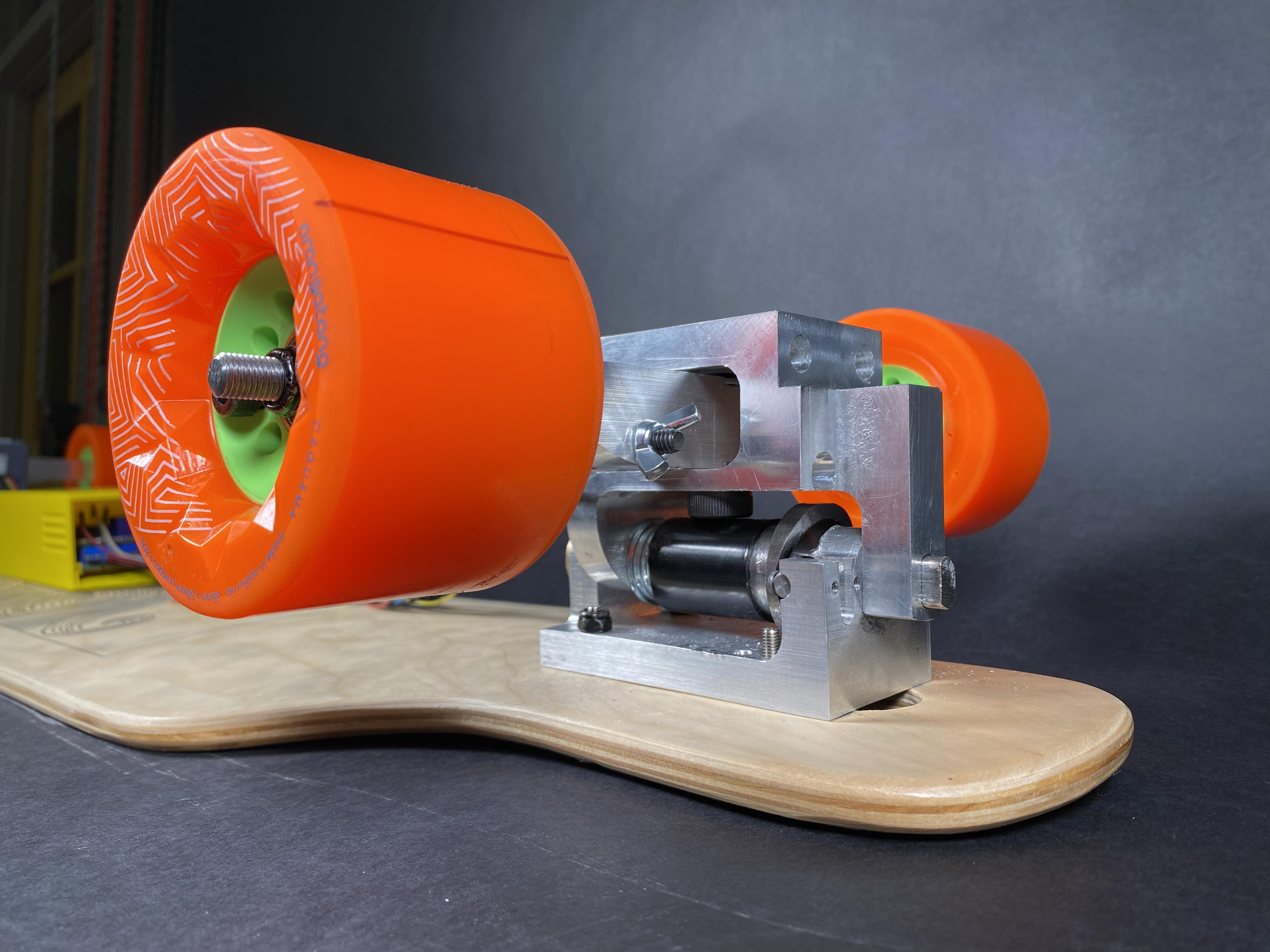 Bydecouplingleaningandsteering,weremovetherider’sabilitytodirectlysteertheboard mechanically.Thiscarriessignificantrisks,especiallysincethetechnologyisstillinitsinception. Anycodingerrors,sensorfailures,orelectricalfailureswouldleavetheuserunabletosteerthe boardmechanically.Furthermore,wewouldseethegreatestimprovementsfromthestandard mechanicalskateboardtoourproposedactuatedtrucksathigherspeeds.Asaresult,beforewe startedtodevelopthetrucks,wecreatedatestingapparatusthatallowsustotestaskateboardat thesehigherspeedswhilemimickingahuman’sweightandinteractionwiththeboard.