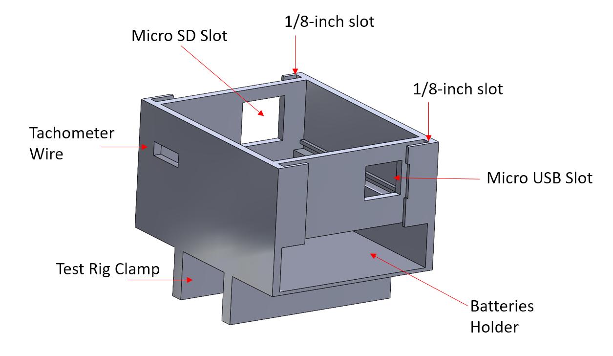 Forthisspecifichousing,thetopisanacrylicsheetthatislaser-cuttofitabuttonthatcreates newfiles,debuggingLED,andpowertoggleswitch.Thetwo1/8inacrylicsheetsonthesideallow ustoaccessthebatterycompartment,micro-SD,andmicro-USBwithoutpenalizingwaterand dustresistance.Thishousingsafelyclampstothetestrigwiththetwolegsatthebottom.The housingadditionallyhasaone-wayclamptosecurelyplacetheelectroniccircuitboard.Thesystem ismademorewater-resistantbyusinghotgluetosealthetopandthetachometerslot.