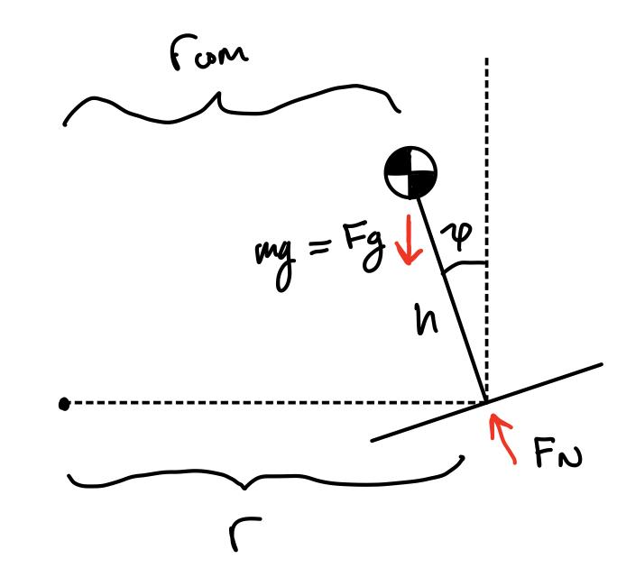 Aswewantourboardtofollowoptimalleansteerphysics,wemustdeterminethis”optimal” relationshipbetweenvelocity,tiltangle,andturningradius.Westartbymodelingthesystemas aninvertedpendulumandcreatingafree-bodydiagram,whichcanbeseeninFigure 14.Using